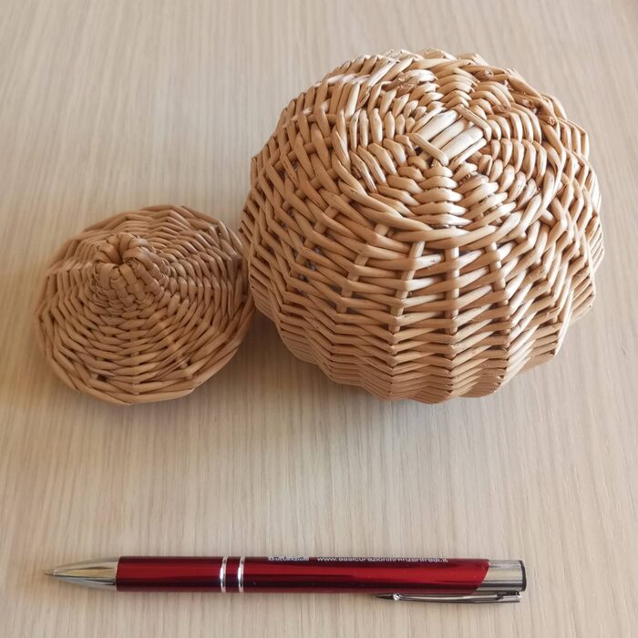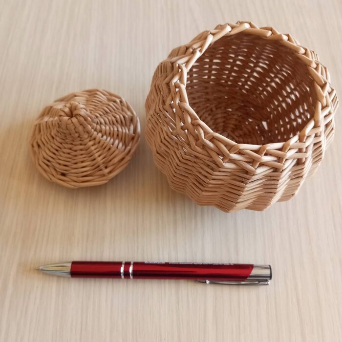 Cestinetto in giunco col coperchio,adatto a vari utilizzi.Penna per le proporzioni .