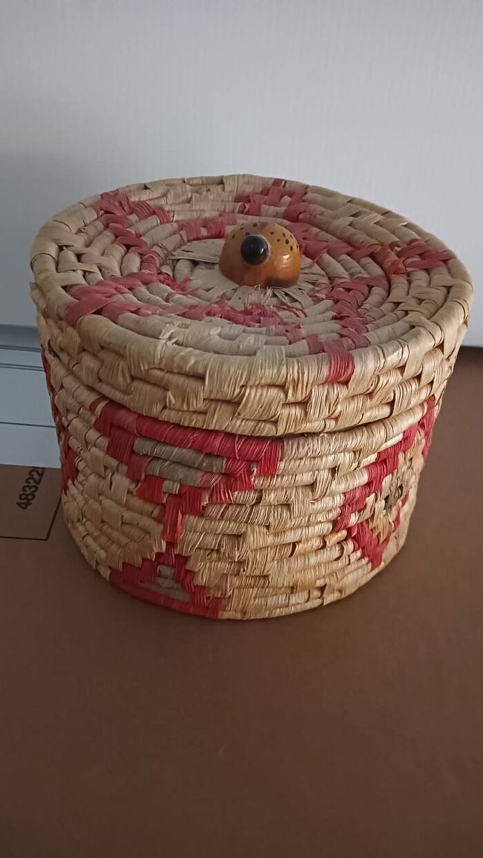 cestino sardo in paglia intreciata misure altezza 10*12 di diametro ,non ci sono sfilacciature ma il sopra del coperchio è vissuto andrebbe messo in acqua e ravvivato .
