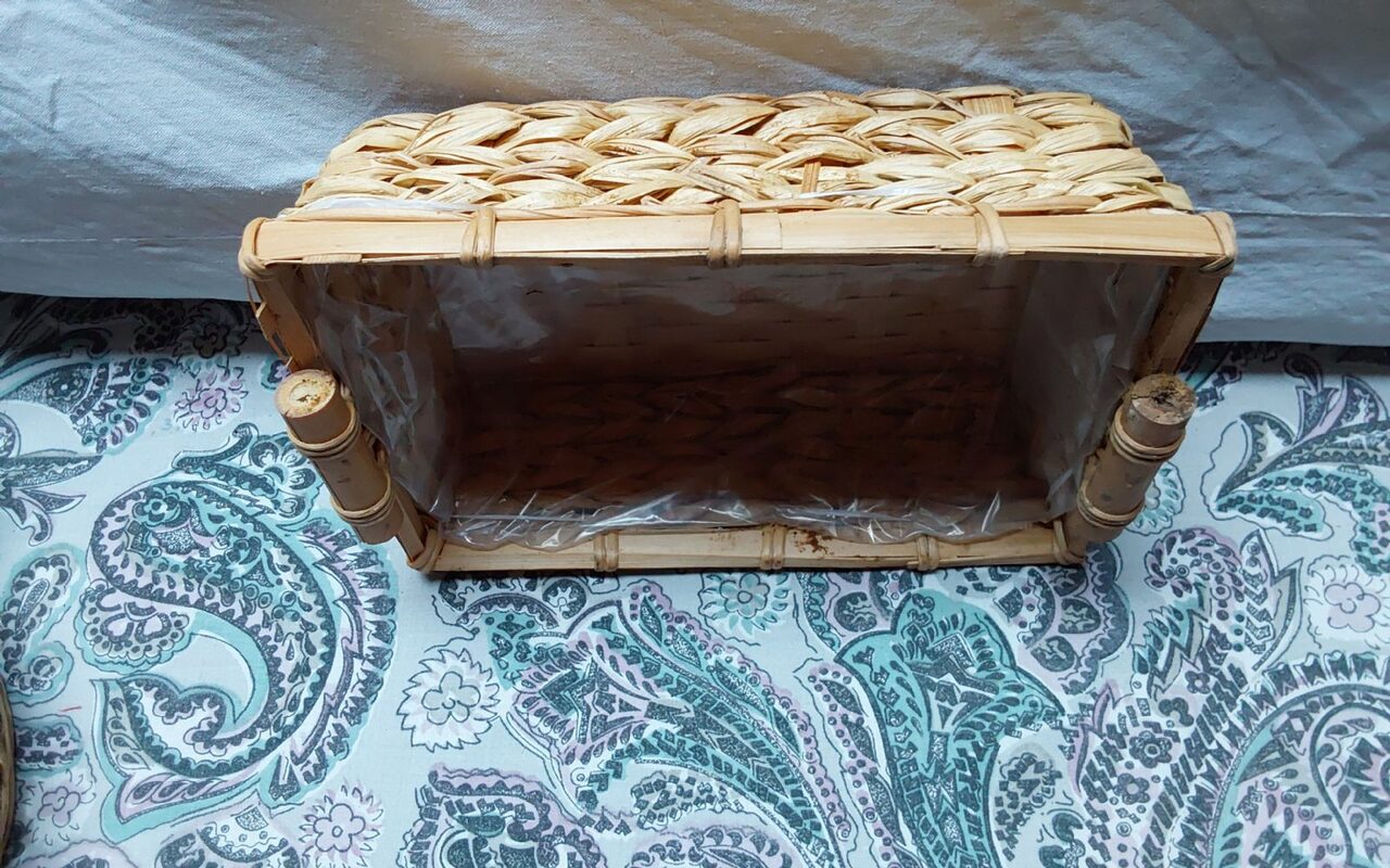 Cestino di vimini con manici in bambo, rivestitimento in plastica, misure 24x17x8, si può usare anche come vaso per piante. .