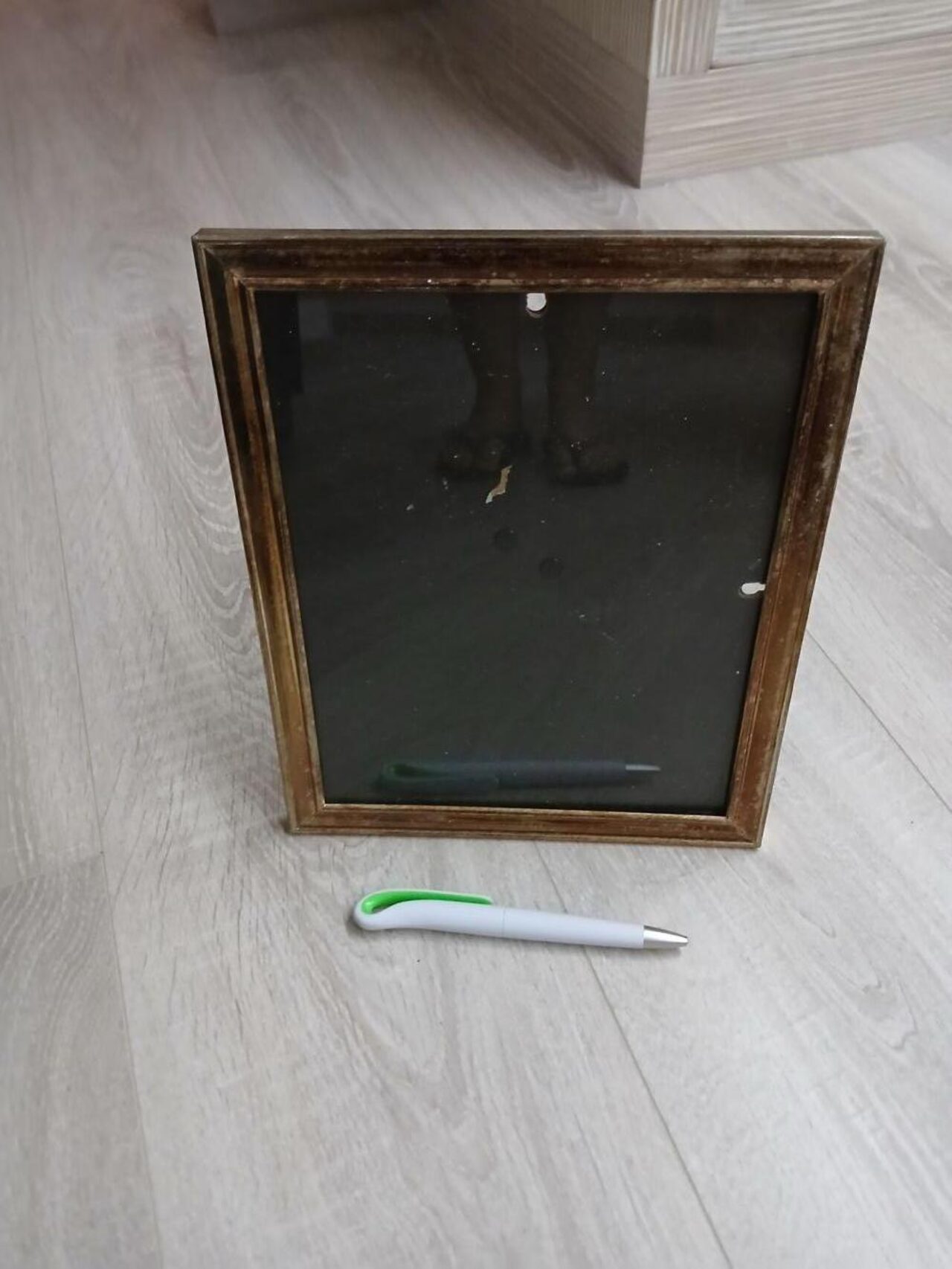 Cornice da tavolo. Non capisco se il bordo è invecchiato o così dall''inizio ma l''effetto a me piace. La parte bassa non ha il fermo ma tenendola sul tavolo non credo che l''eventuale foto possa cadere. Penna per le dimensioni. .