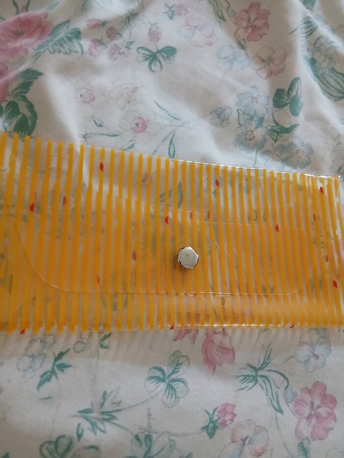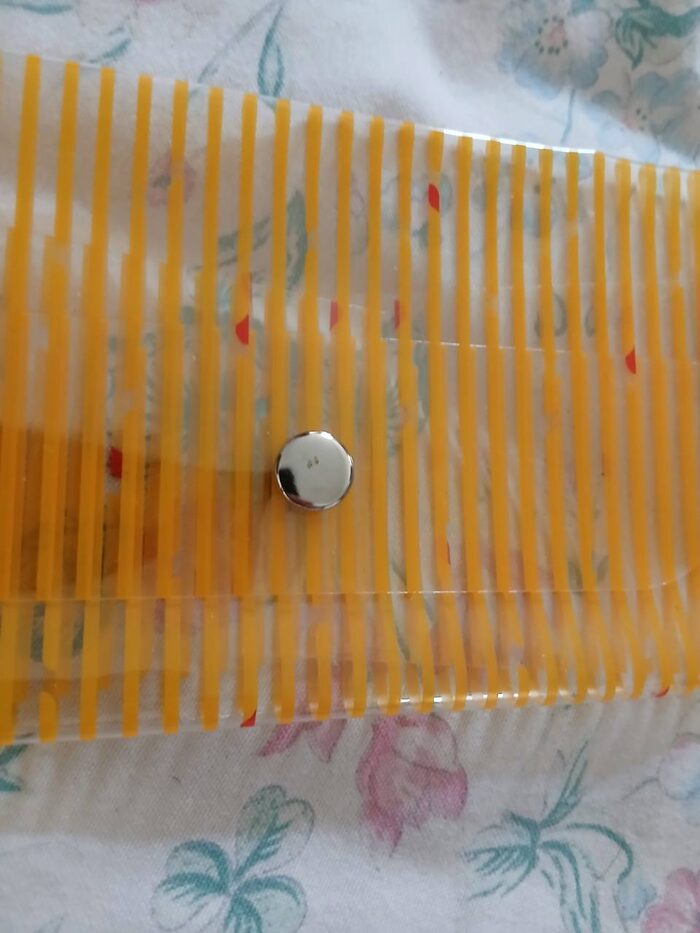 Piccola pochette/ astuccio trasparente con bottone per la chiusura, a righe gialle verticali con puntini rossi. Dimensioni 21,5 cm x 9,5 cm. .