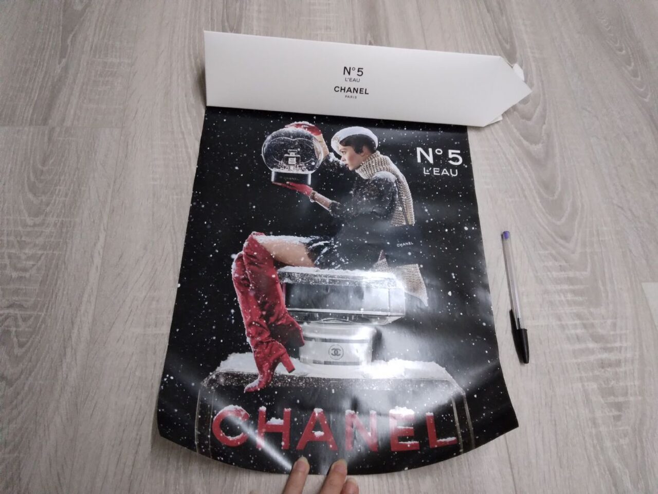 Poster pubblicitario Chanel n. 5 di qualche anno fa. Penna per le proporzioni. Completo di scatola. Spedisco con collettiva .