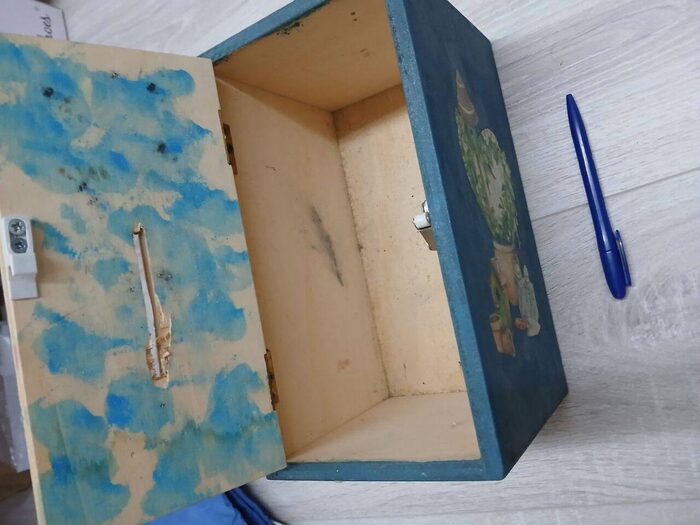 Scatola di legno fatta a decoupage. Molto ampia. Si apre con chiusura a pressione perfettamente funzionante. Ha la fessura sopra per usarla anche come salvadanaio. Solo da ripulire un pochino.