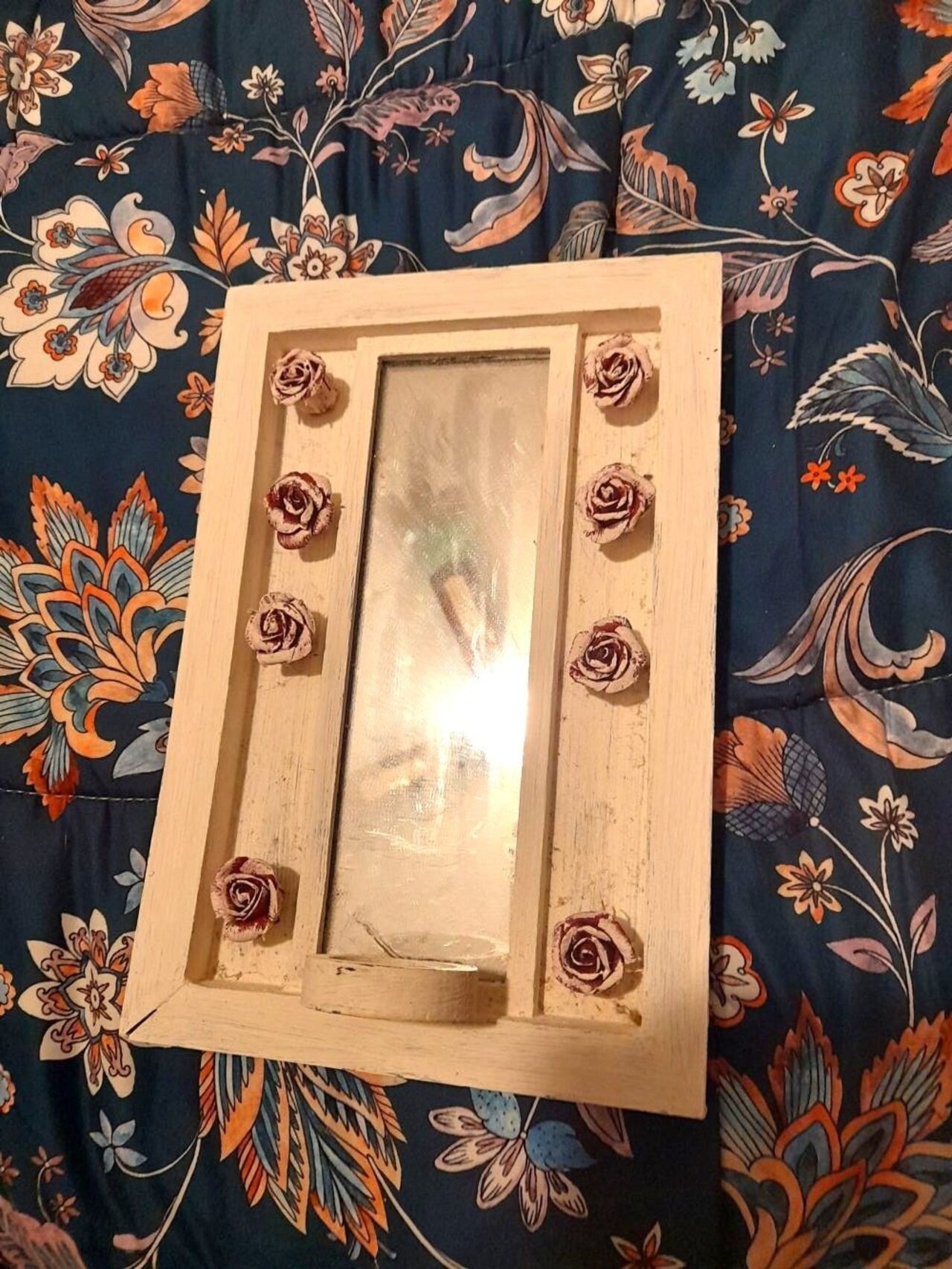 In legno con roselline 28x19 cm con spazio sotto per mettere qualcosa, forse una tea light. Sembra scuro, ma è bianco nel link altre foto .
