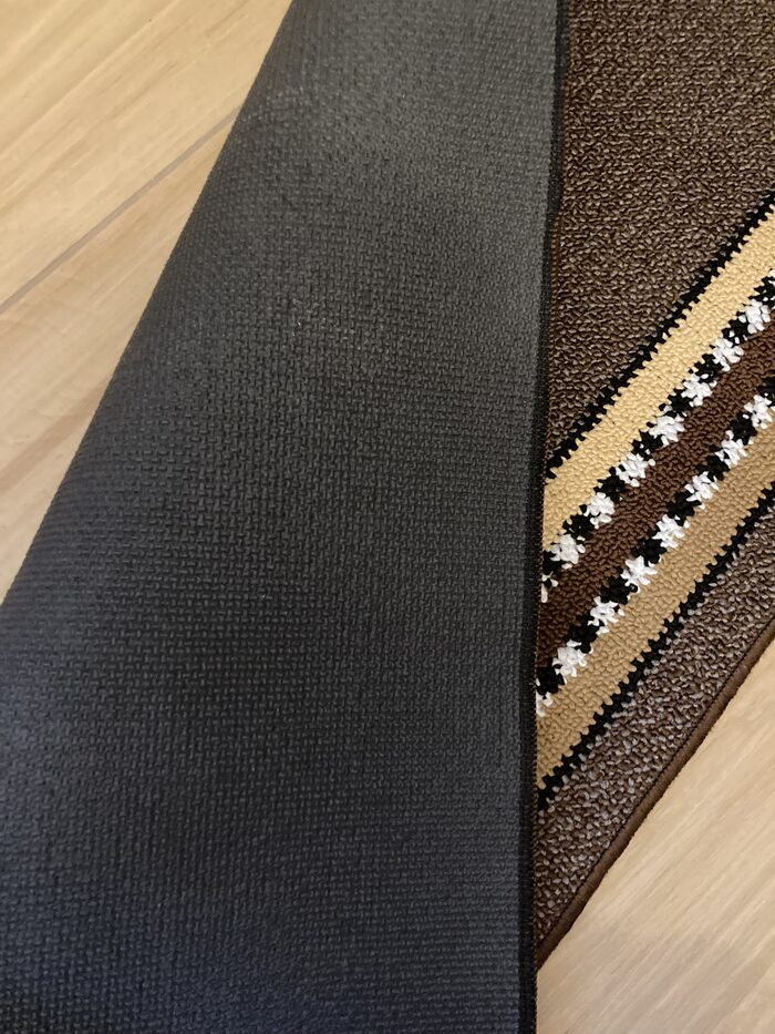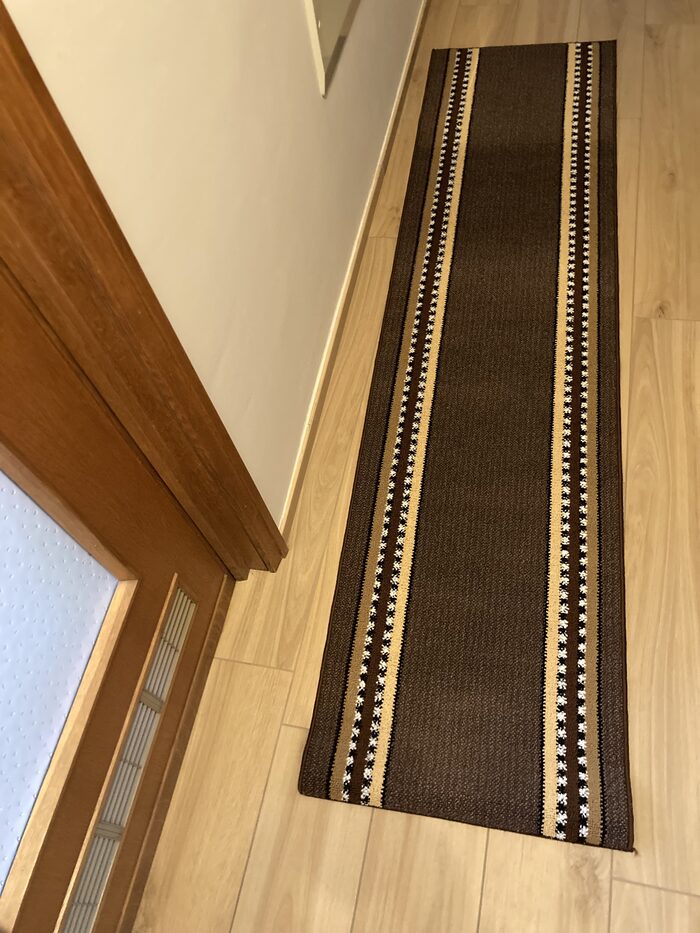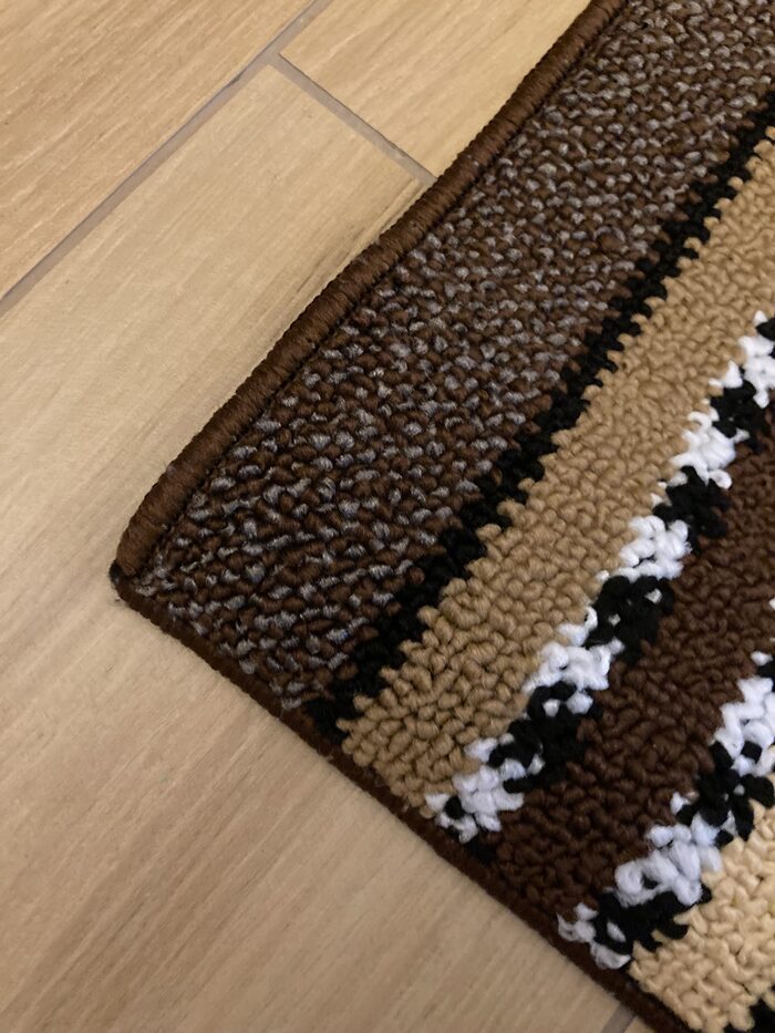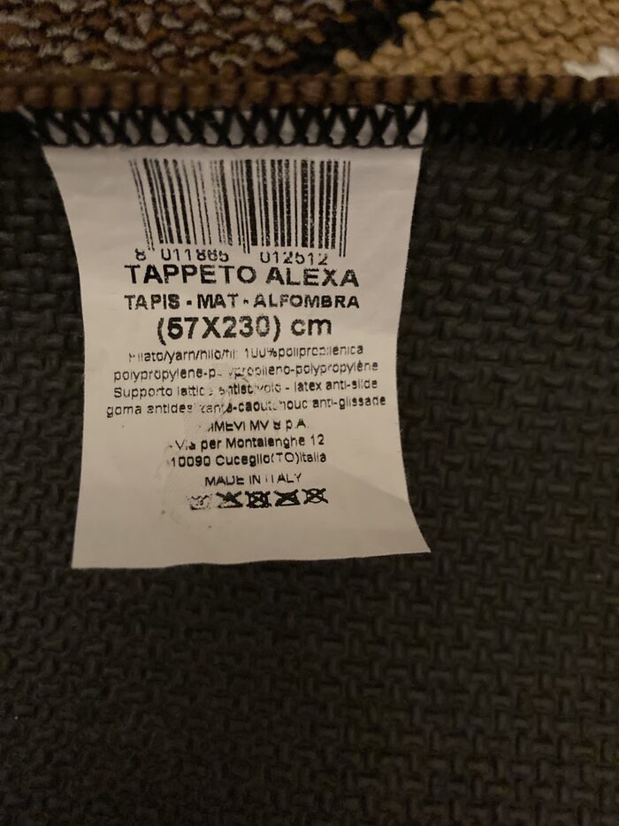 Usato una sola volta, poi ne ho comprato uno che mi piace di più. Lavabile in lavatrice. Retro in gomma/plastica. Marrone, bianco, nocciola, beige e un po’ di nero. Misure esatte: 56 x 227 cm. Arrotolato misura giusto 56 x 13 x 11. Somma dei lati 80 cm!!! .
