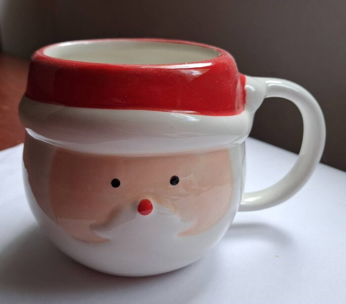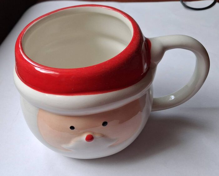 Simpatica tazza natalizia Babbo Natale, ricevuta con dentro cioccolatini e tenuta esposta qualche settimana. Mai usata per bere.