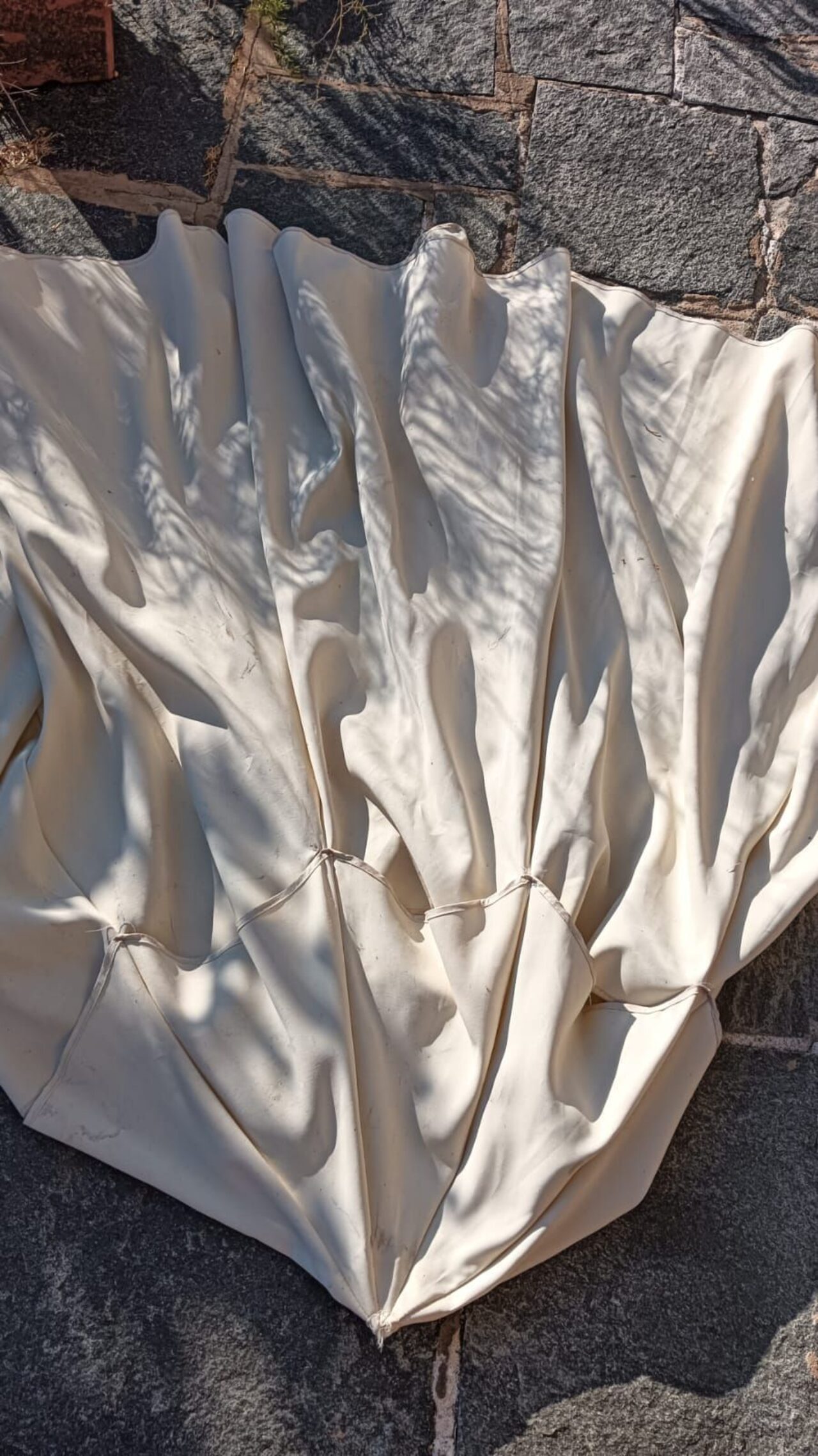 in tessuto pesante tipico degli ombrelloni quelli buoni:) il sostegno centrale era rotto il telo è perfetto.lo consegno lavato diametro 250 cm circa monta 8 stecche .