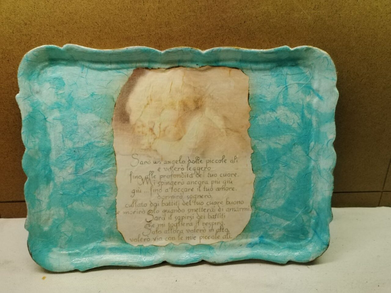 Vassoio azzurro in legno con poesiaDimensioni 36 x 26 .