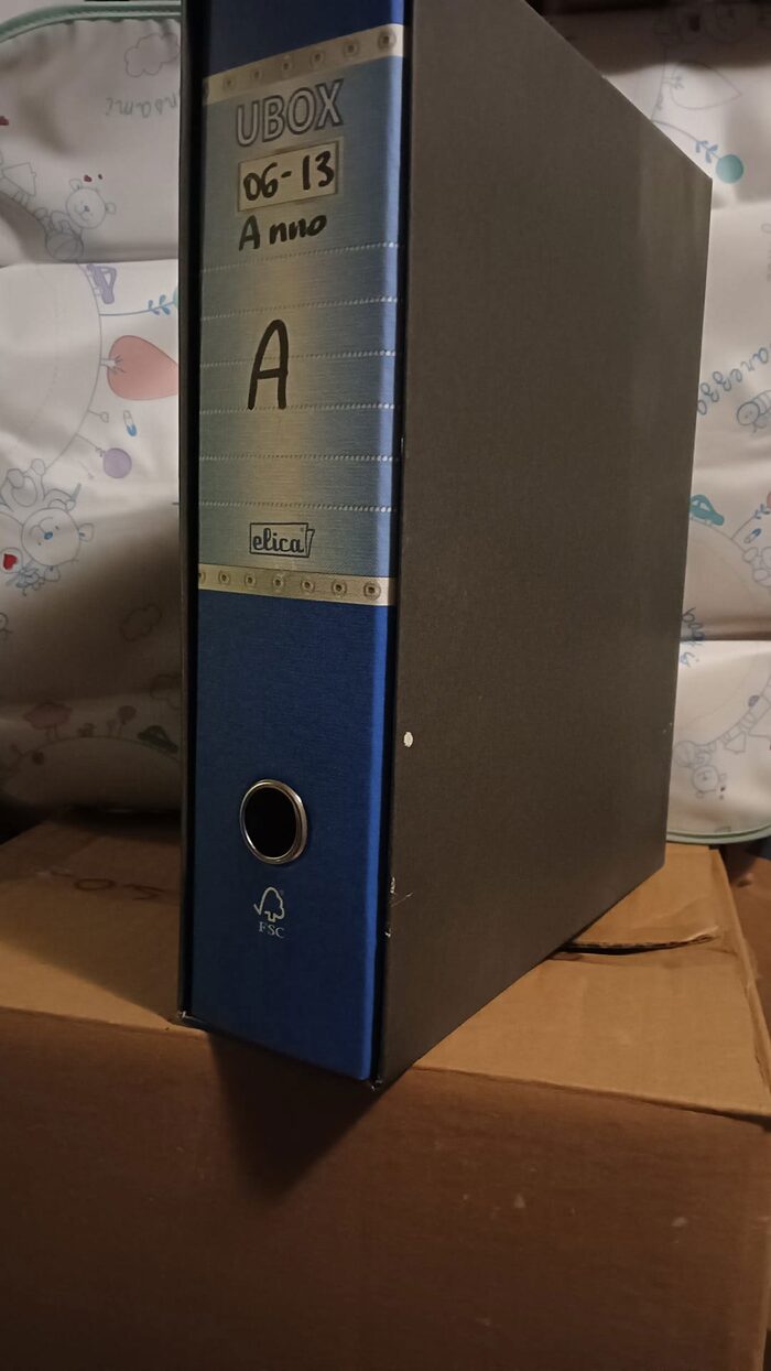 raccoglitore a due anelli per archiviazione fogli A4 con la relativa custodia in cartone rigido e metallo gli anelli .Consegno n modo che dentro ci possa andare altro per la spedizione finale.Misure larghezza 28 altezza 34 profondità quasi 8