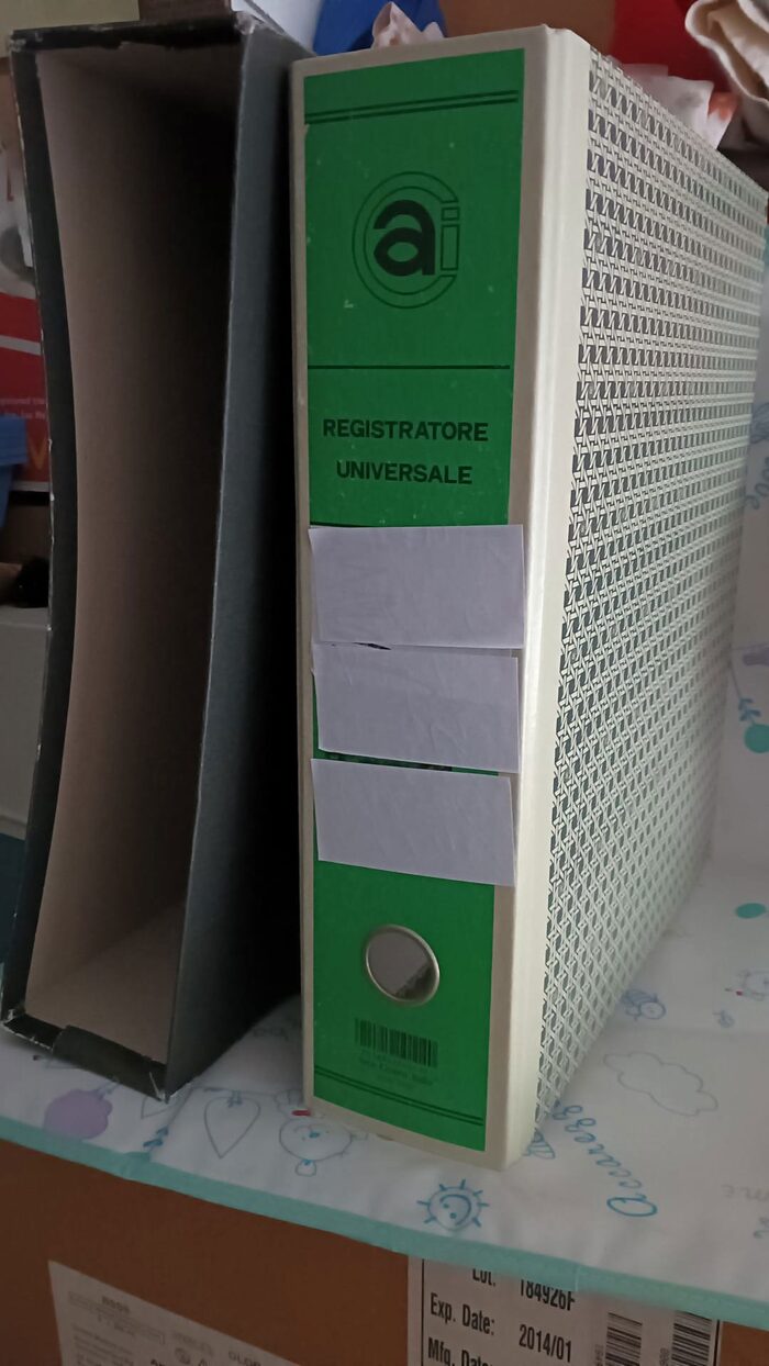 raccoglitore a due anelli per archiviazione fogli A4 con la relativa custodia in cartone rigido e metallo gli anelli .Consegno n modo che dentro ci possa andare altro per la spedizione finale.Misure larghezza 28 altezza 34 profondità quasi 8 .