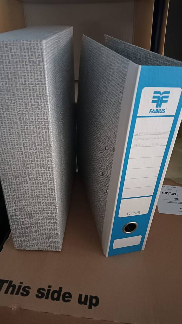 raccoglitore a due anelli per archiviazione fogli A4 con la relativa custodia in cartone rigido e metallo gli anelli .Consegno n modo che dentro ci possa andare altro per la spedizione finale.Misure larghezza 28 altezza 34 profondità quasi 8 .