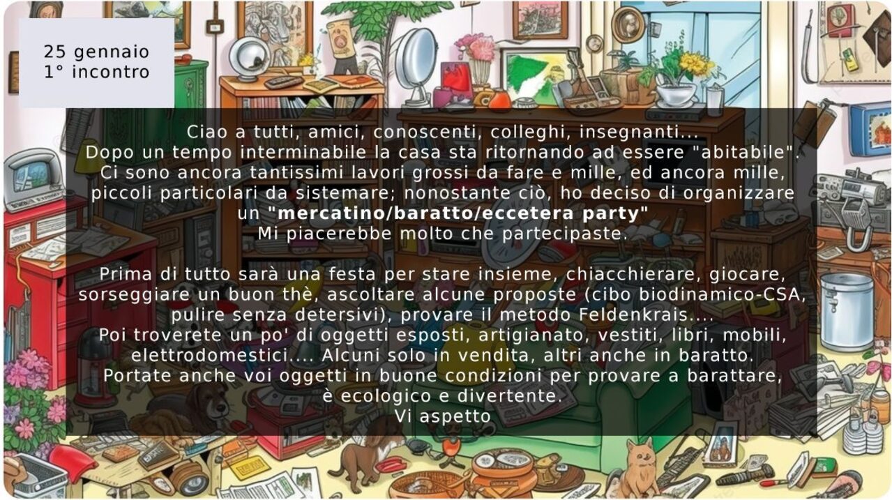 Sto organizzando il primo di una serie di incontri intitolati "mercatino/baratto/eccetera party"Aperto a chi mi viene in mente possa essere interessato.Spero non verranno solo gli "abitanti" di coseinutili....Sotto la trascrizione di ciò che ho scritto sull'immagine .