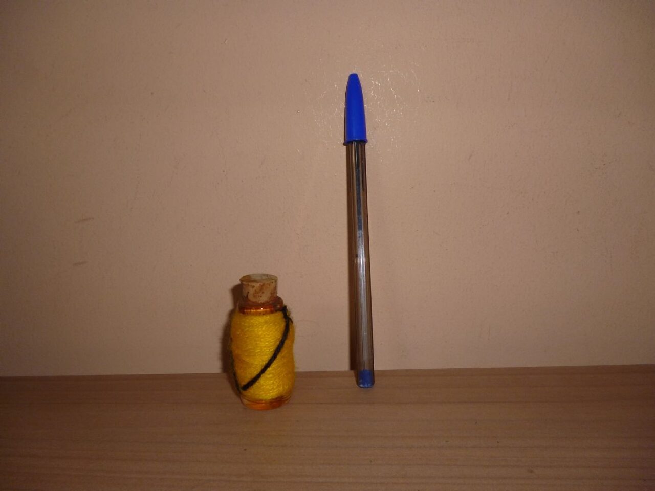 Boccetta dalla Tunisia che conteneva profumo. In vetro coperto con lana gialla e tappo in sughero. La capacità sarà di 7-8 ml .