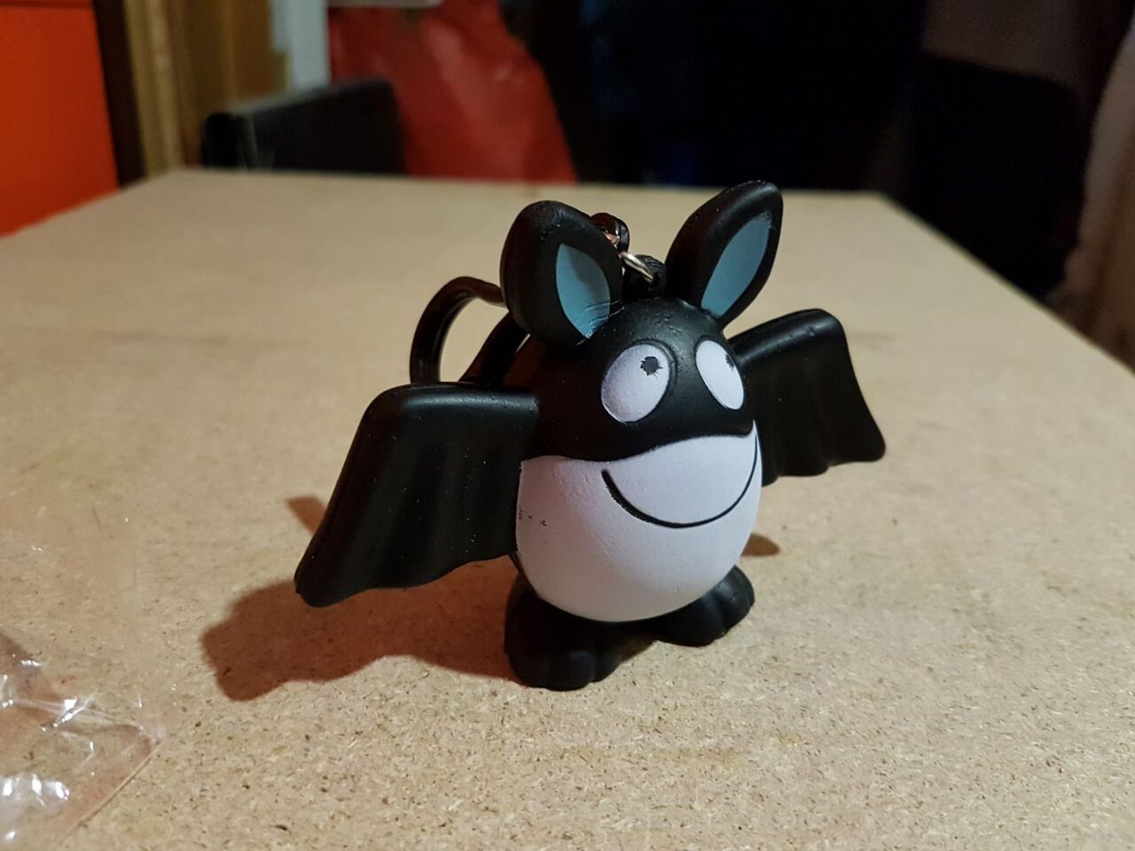 Portachiavi in gomma molto morbido e leggero, con gancio in plastica, rappresenta un pipistrello. Ne ho circa 10 .