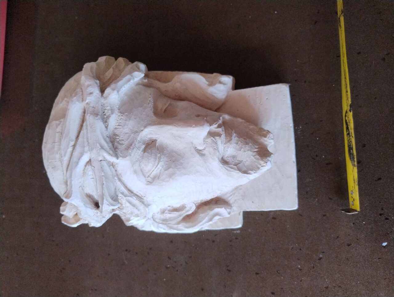 È leggero sembra di un materiale tipo gesso .Credo abbia delle parti da pulire un po' misura 14 x 20 cm circa .