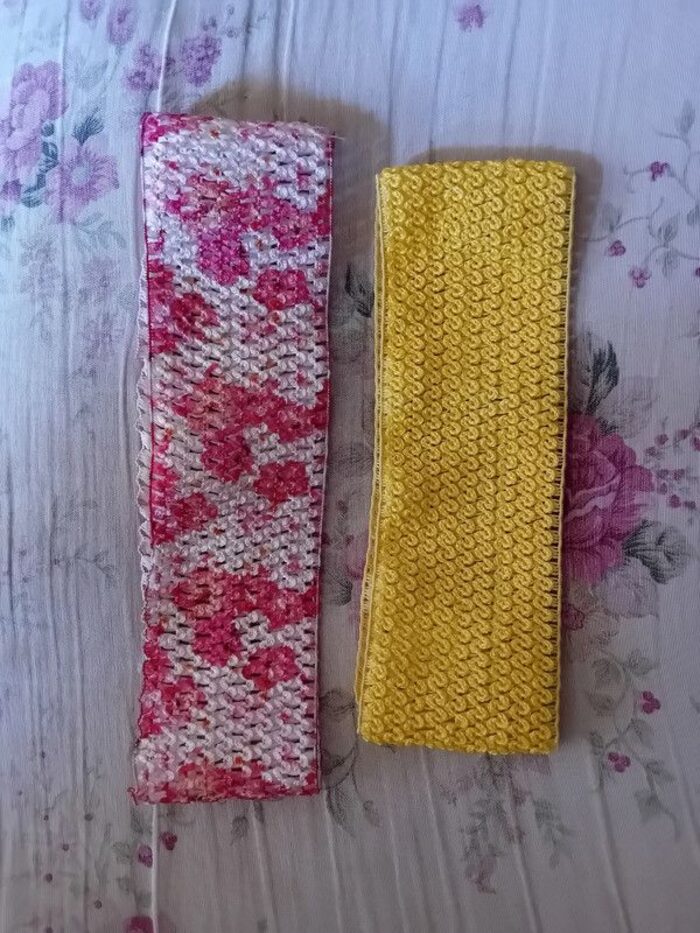 Elastiche, direi sintetiche, una bianca e rosa a fiori, l''altra gialla a tinta unita. Comprate e mai usate. .