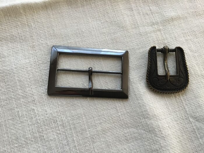 2 fibbie tolte da cinture rovinate.Una grigia scura lucida per cintura larga 4,5 cm; quella in ottone brunito per cintura larga 1,5 cm.Posso dividere. 1 credito cadauna. .