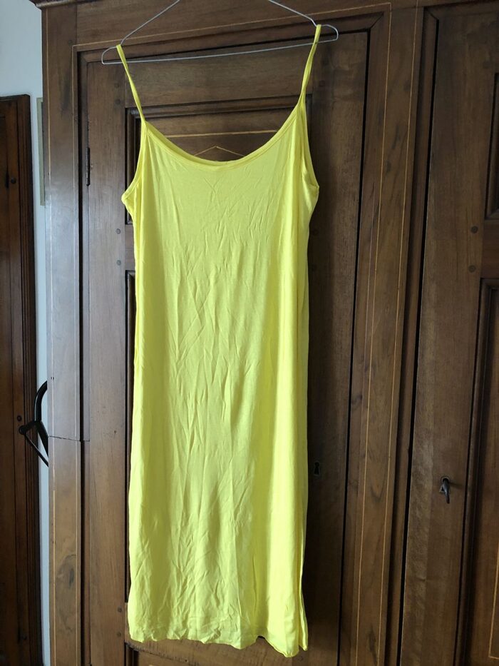 Abito ampio e lungo Viscosa e setaSenza taglia perché penso venduto come taglia unica, metto le misureL’unica etichetta che c’è è quella fotografata Leggero. Con sottoveste che è staccata. Fotografata da sola nell’ultima fotoLunghezza totale 130 cm Larghezza presa sotto le maniche 55x2 cm , poi si allarga con delle balzeUsato poco o niente .