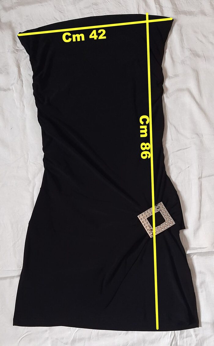 Abito vintage anni 2000, in jersey nero elasticizzato. Modello aderente con arricciatura laterale su entrambi i fianchi, punto vita sceso, gonna leggermente svasata. Dettaglio laterale con volant che passa in una fibbia in plastica argentata.In ottimo stato, unico difetto l''etichetta taglia cancellata.Tessuto in jersey 94% poliestere e 6% elastan.Taglia indicativamente L, misure in foto. .
