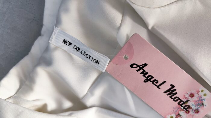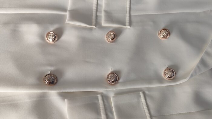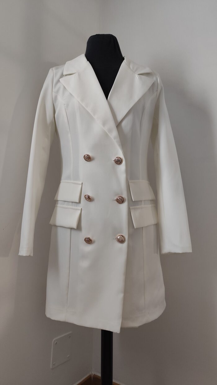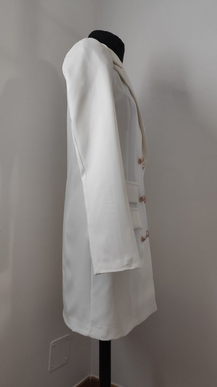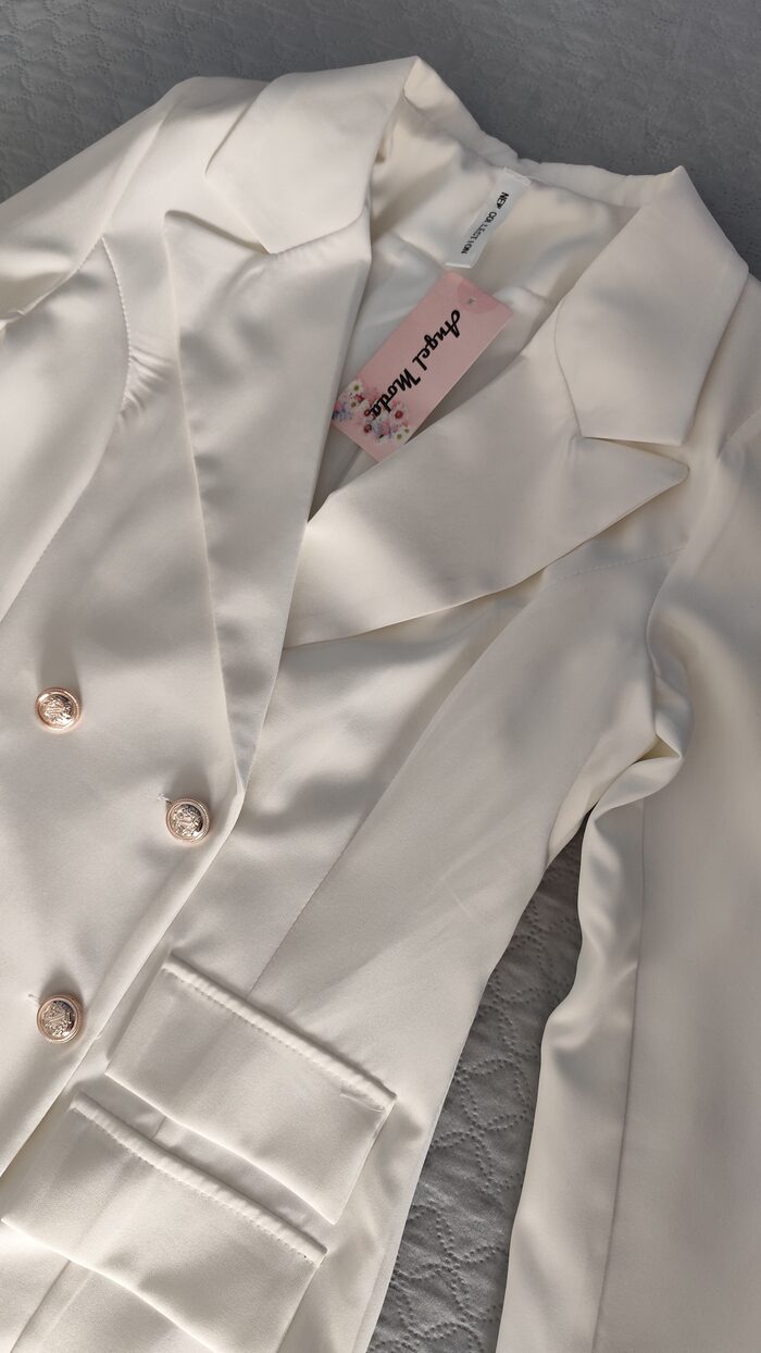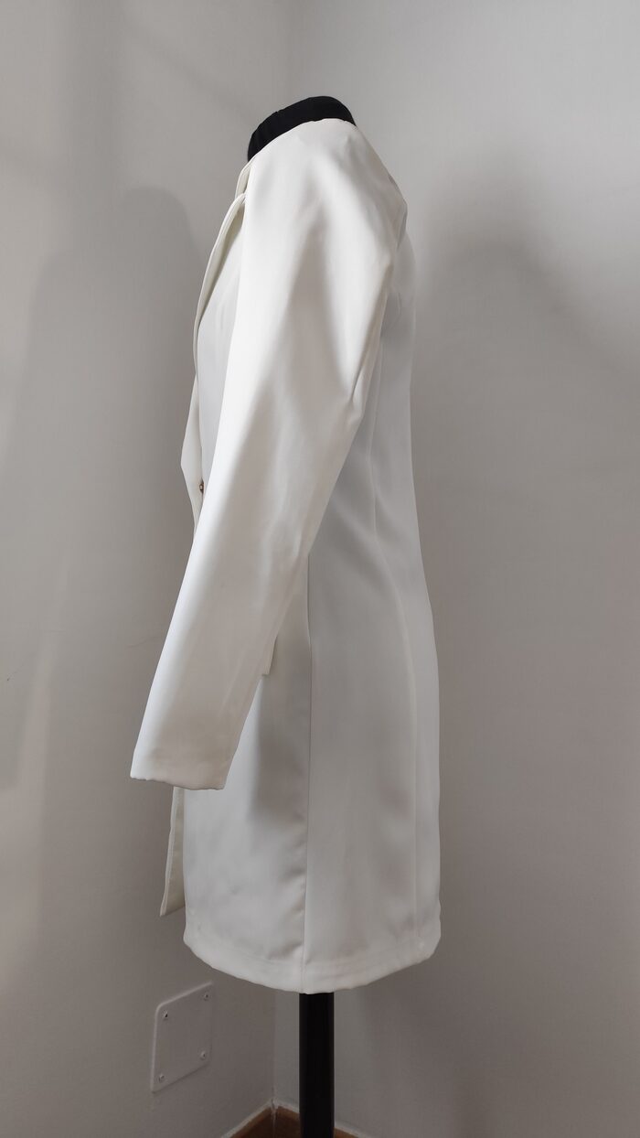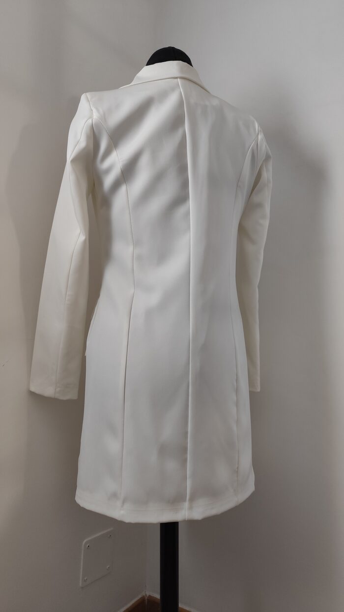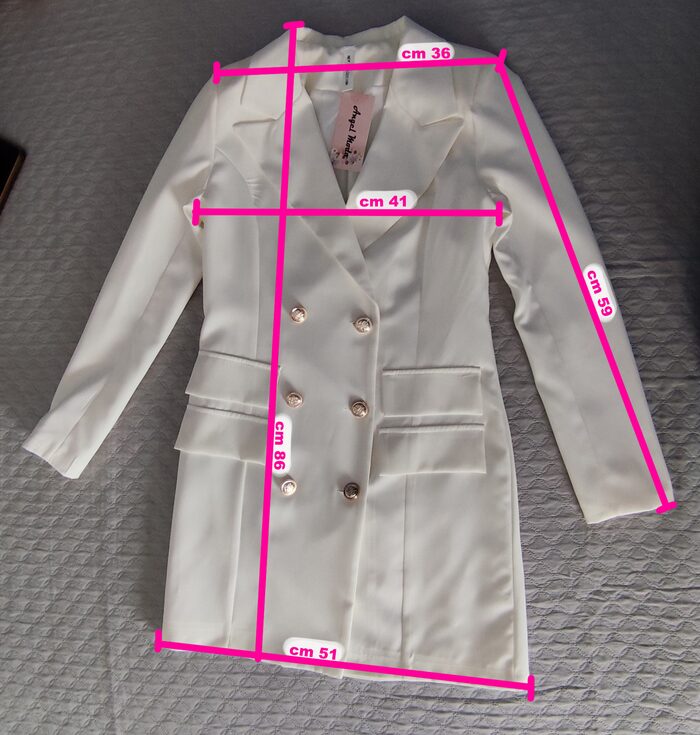 Abito-giacca bianco corto, modello doppiopetto a manica lunga con scollatura a V; un po’ stretto in vita e interamente foderato, ha 6 bottoni in stile marinaro e tasche frontali finte. Vestito nuovo con etichetta, elegante e particolare, adatto anche per cerimonie o eventi.