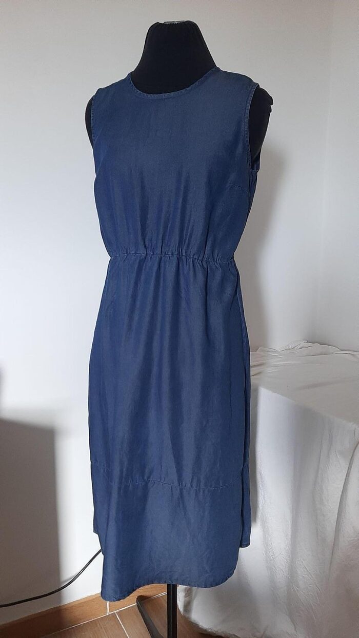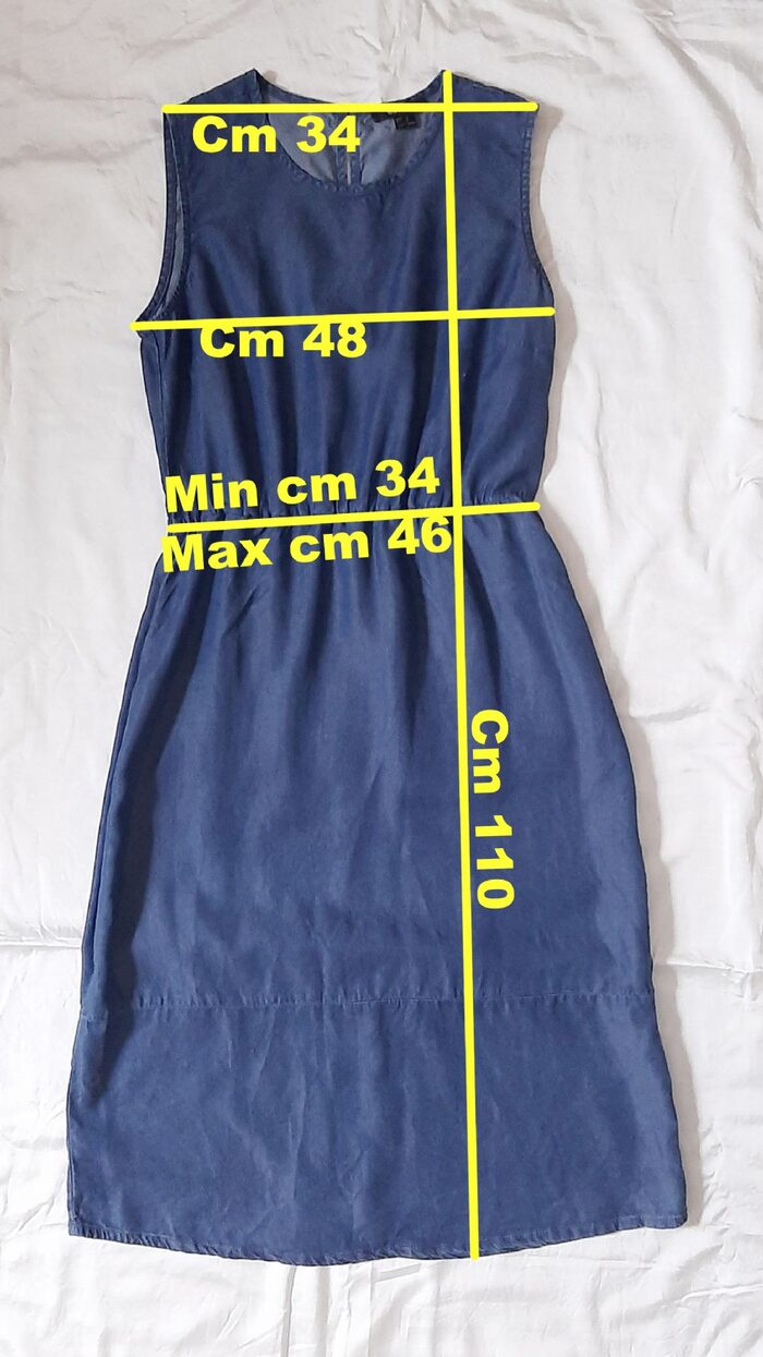 Abito Esmara, longuette in Lyocell, fibra semi sintetica ecologica prodotta dalle piante di eucalipto, simile alla viscosa.Modello smanicato con arricciatura in vita, gonna dritta e chiusura sulla nuca con un bottone.Molto bello anche per il periodo autunnale abbinato ad una camicia o maglioncino.in ottimo stato, non presenta difetti.100% Lyocell.Taglia IT 38, misure in foto .