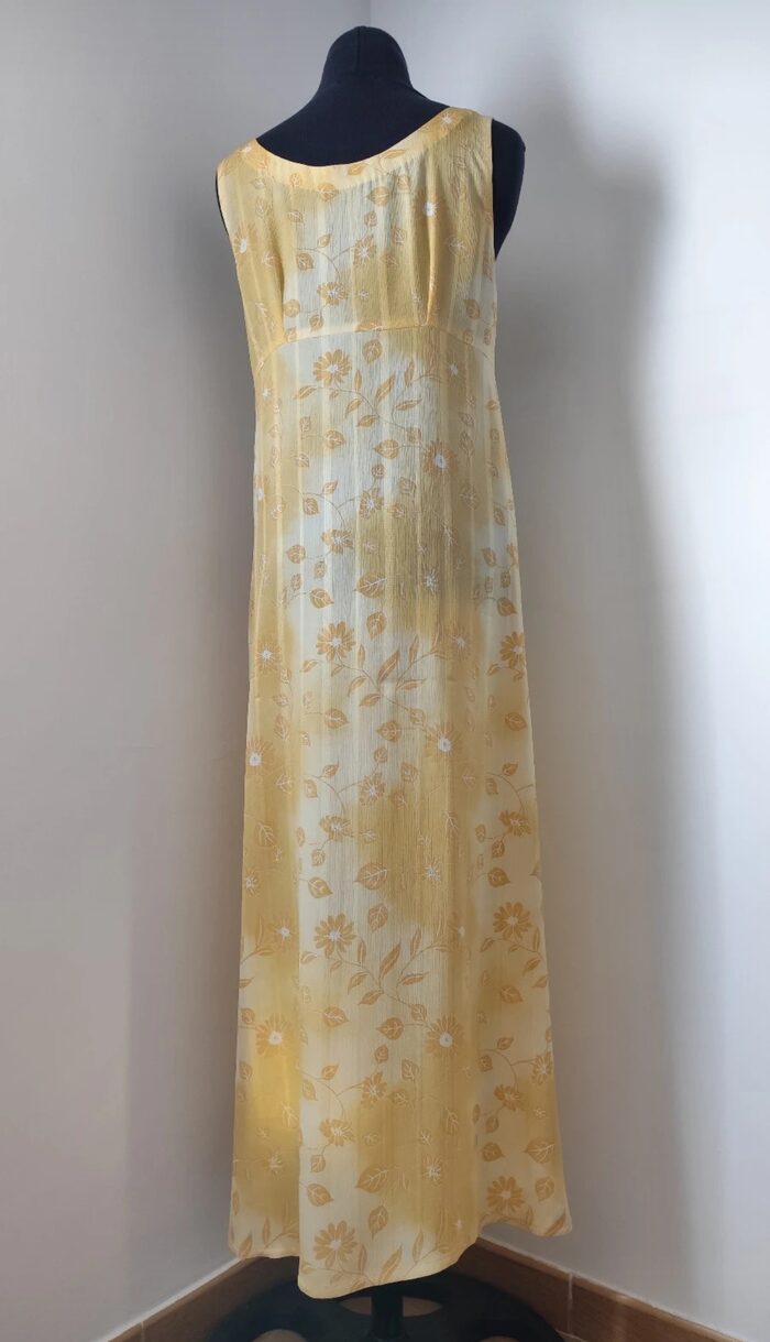 Abito lungo elegante, sartoriale, in tessuto leggero giallo sfumato con stampa floreale; modello stile impero senza maniche, scollo a V, taglio in vita e zip laterale invisibile. Rifinito in ogni dettaglio con grande precisione, insieme ha uno scialle dello stesso tessuto con anello. Realizzato a mano, in perfetto stato.