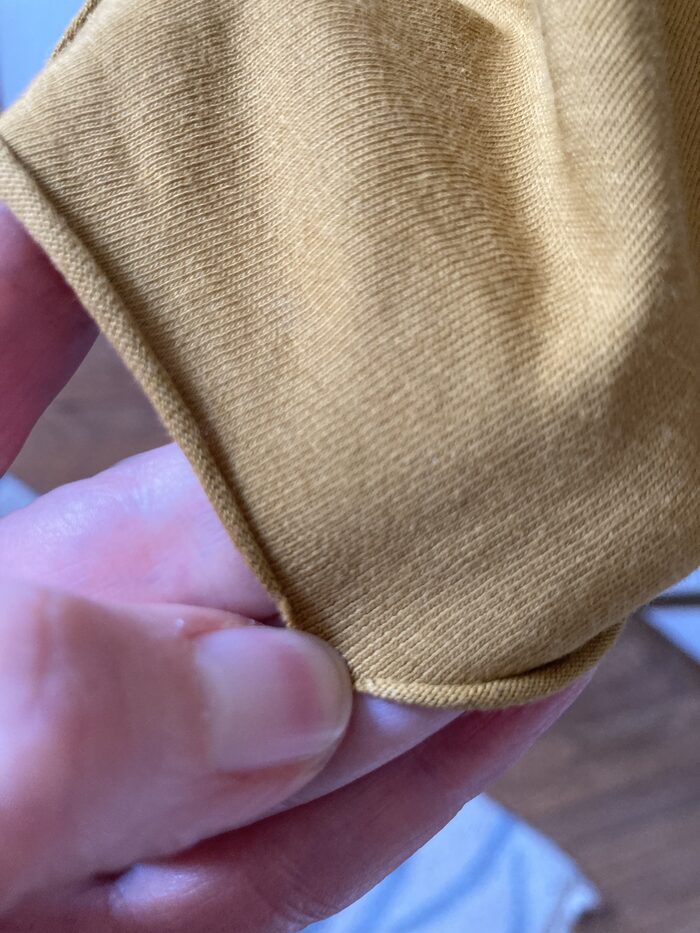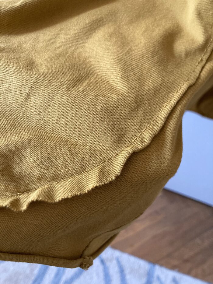 Color senape. L’etichetta è stata tagliata, ma credo sia cotone elasticizzato. Veste diverse taglie, data la forma molto ampia.Misure: spalle 40, ascelle 54, lunghezza 93.Orli a taglio vivo.Ha due tasconi sul fondo, laterali. .