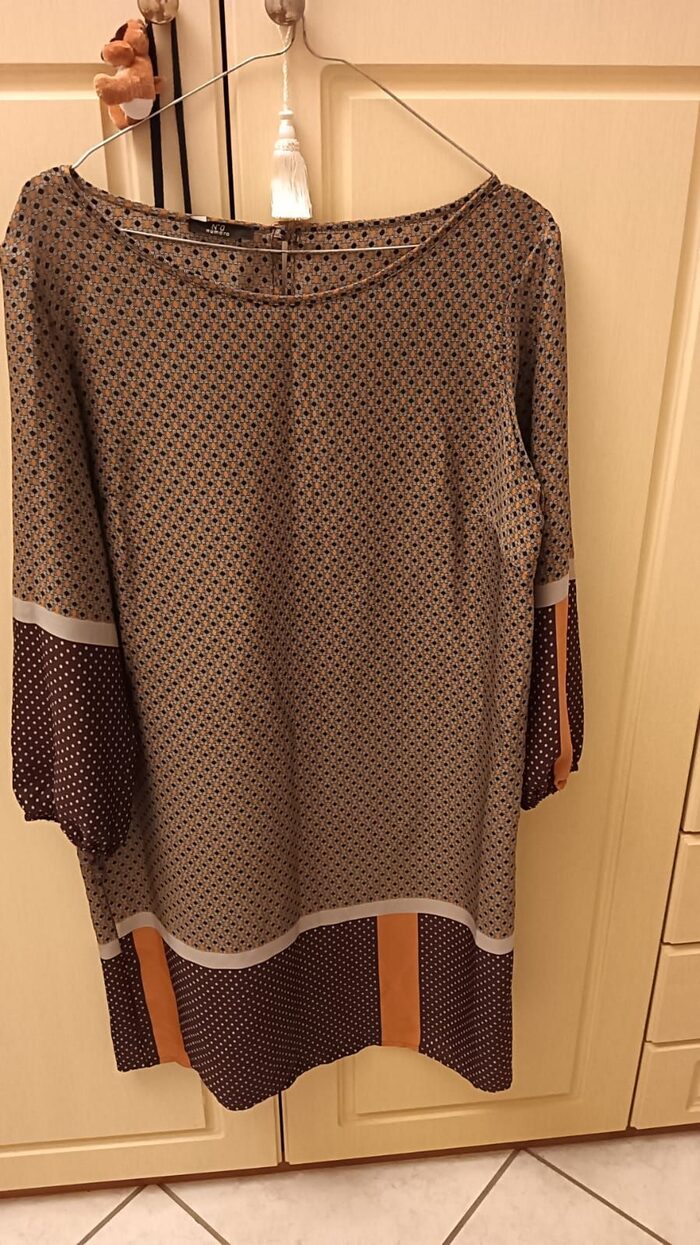 Abito comodo, nei toni caldi del marrone e arancione, tessuto credo sintetico, veste taglia m 42 44 .