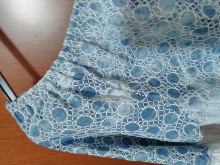 In cotone azzurro jeans delavé con ricamo e inserti in sangallo, molto graziosa. Veste una 44 .