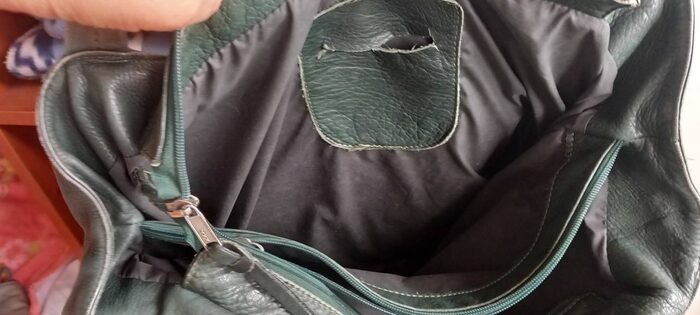 pelle verde scuro, che lucido prima di inviare,cm40 x 25 x 20 profnon tanto usata ma un po' scolorita ma ho lucido verde apposito .