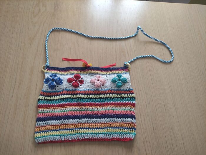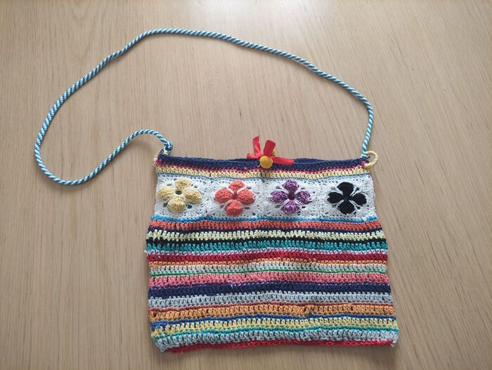 Borsa fatta da me all''uncinetto, in cotone, foderata, nuova. Misura 30x 28 tracolla 106 cm .