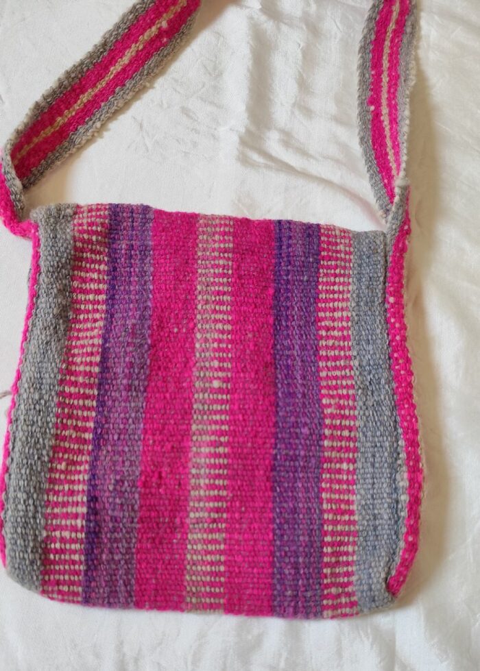 Borsa a tracolla vintage rosa e verde, multicolore, in stile etnico, fatta a mano probabilmente in lana. Modello molto semplice a sacchetto senza chiusura, ha solo pattina con frangia.In ottimo stato, non presenta difetti. Non ha etichette.Misura cm 23x23, tracolla cm 125. .