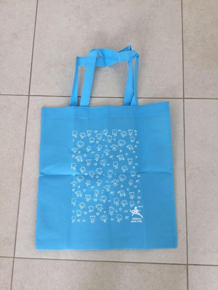 Borsa per spesa turchese con disegni stilizzati di bimbi. Identica sui due lati.Misura 37x39 di altezza + manici.Nuova, spiegata solo per fare la foto .
