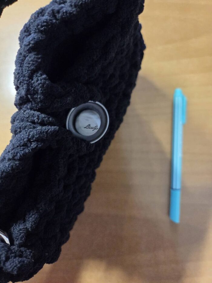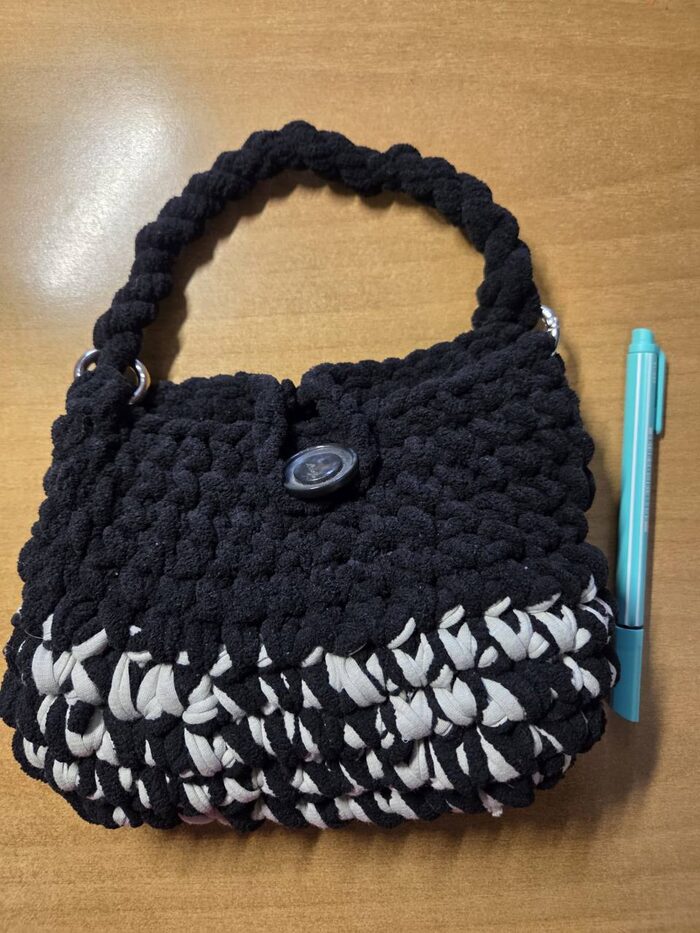 Borsetta nera e bianca con manico e bottone fatta all'uncinetto .