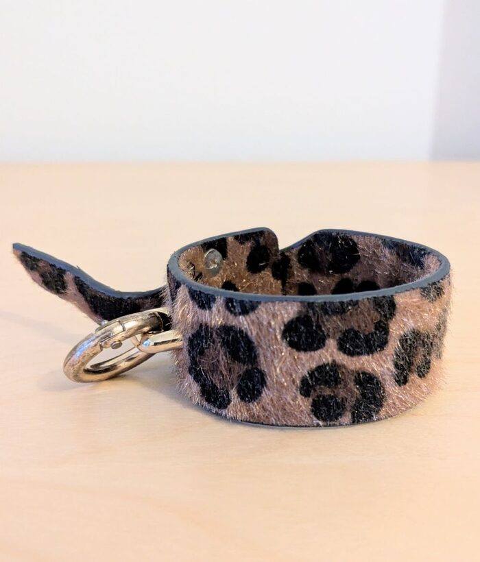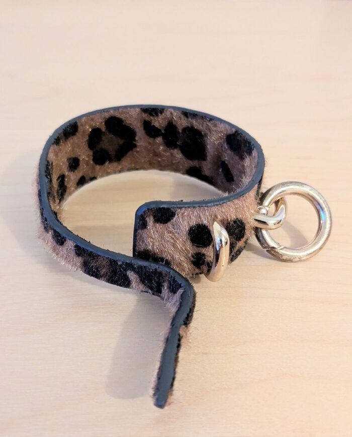 Bracciale in cuoio ricoperto di eco pelliccia con effetto brillantinato. Altezza cm 2,5 - lunghezza totale cm 27. Ha un moschettone tondo quindi può essere usato anche come portachiavi .