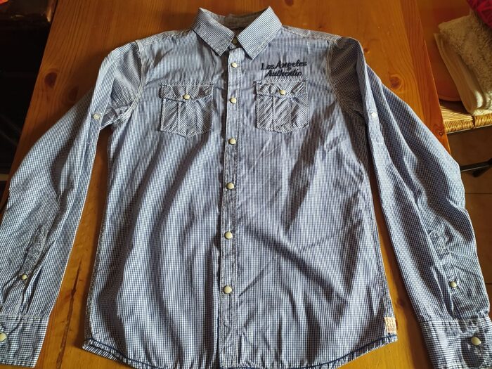 Camicia a quadretti bianco/blu particolare senza etichetta composizione, credo cotone, con disegno sul retro, spalle cm 40, ascelle cm 46, lunghezza cm 63. .