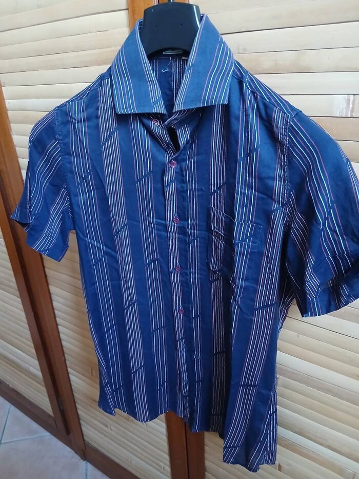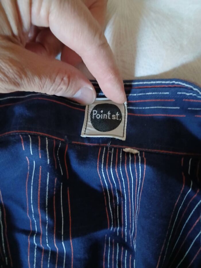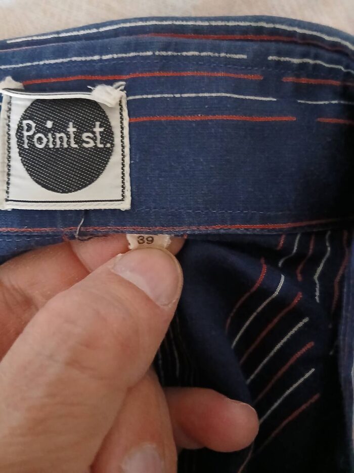 Marca Point. St., collo 39 ( taglia S), in colore blu scuro con leggere righe bianche e rosse in verticale. Etichetta della composizione non presente, ma quasi sicuramente si tratta di cotone. .