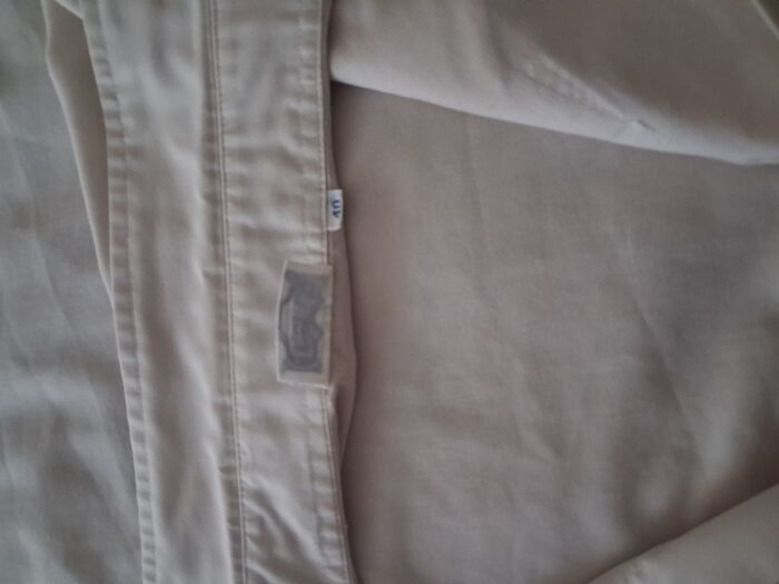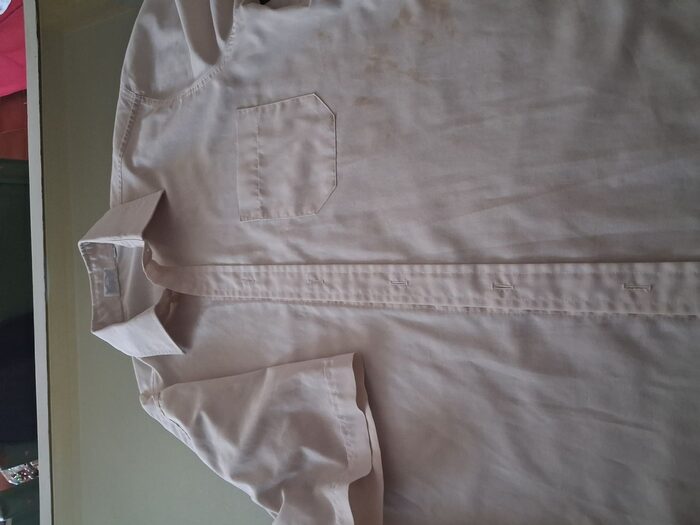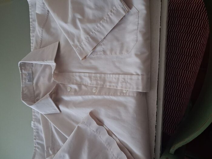 camicia da uomo mezza manica, taglia 40 (collo)tessuto: 35 cotone/65 sintetico, il colore è un beige chiarissimo buone condizioni, nessun difetto anche il collo è in ordine, di facile stiratura è spiegazzata perchè l''ho lavata ma non stirata...e non la stiro... .