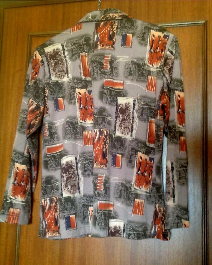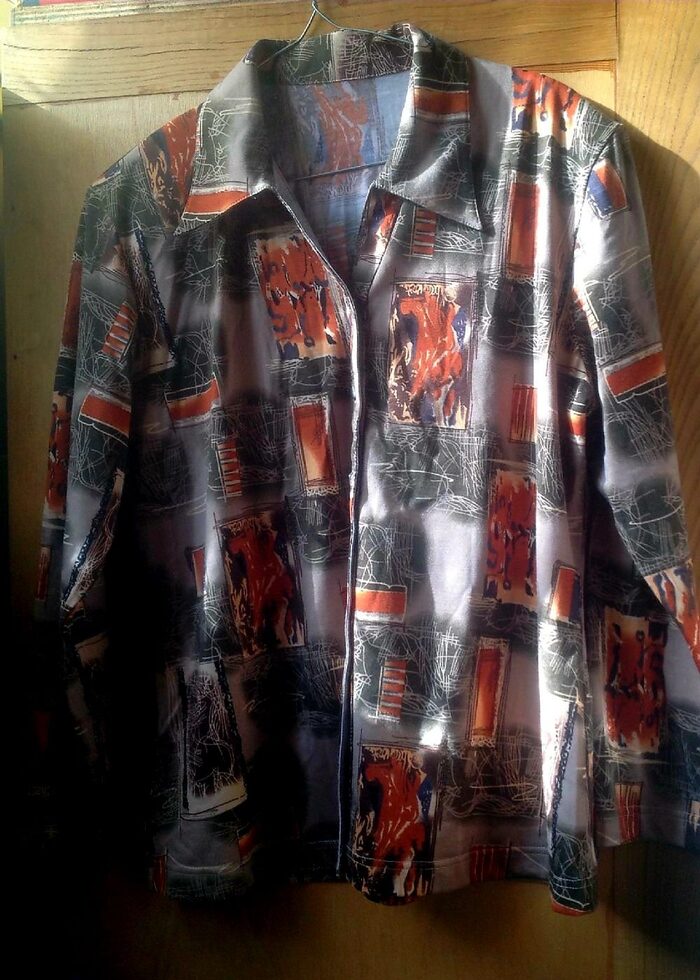 Camicia di mia zia, vintage o quasi, ma credo mai usata, nuova. Jersey di 95% cotone 5% elastica, tg non pervenuta, metto XL ma non lo so, fate riferimento alle misure: spalle 45 e ascelle 54 cm. Bottoni quadrotti di metallo, spalline (volendo scucibili). Ai polsi è come una maglia, senza bottoni. .