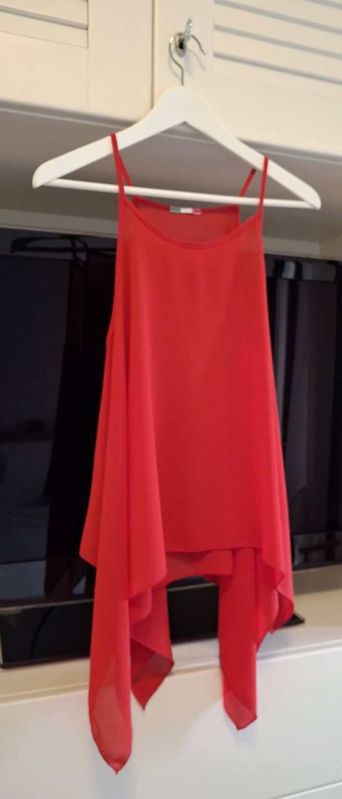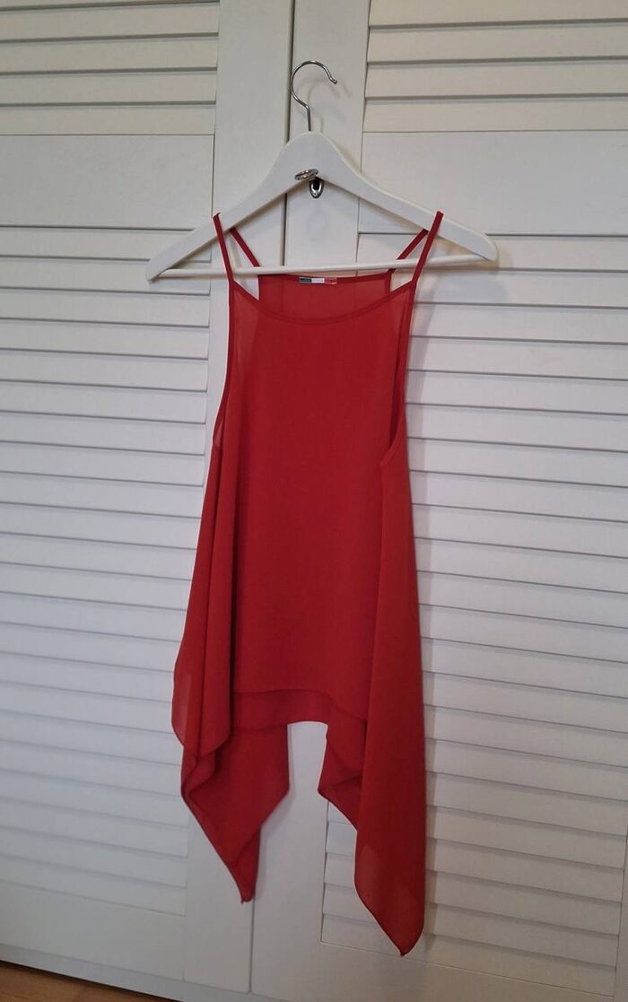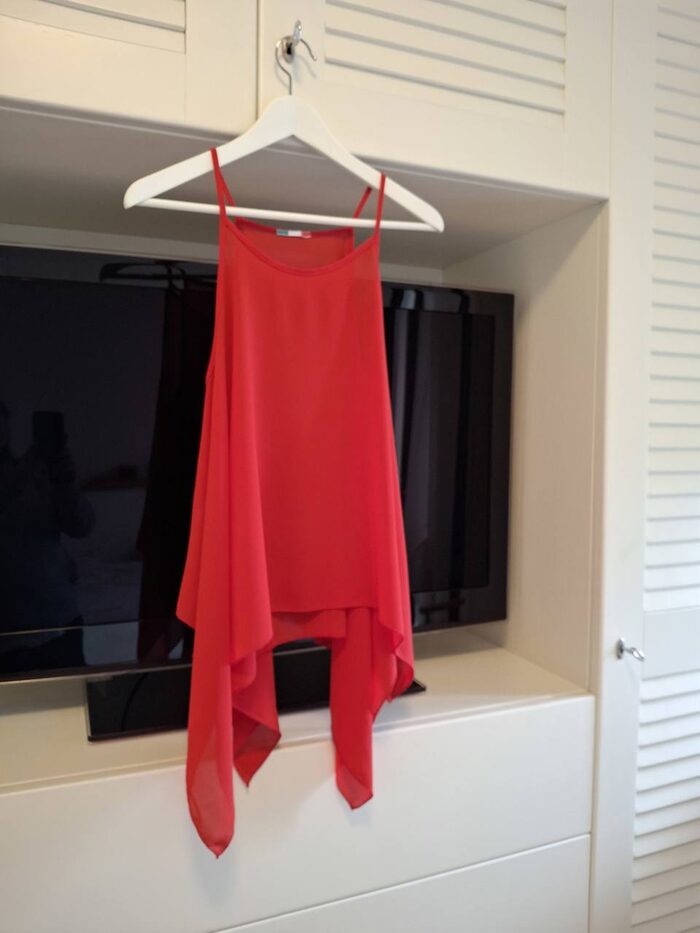 Bella canotta estiva dal taglio asimmetrico, tessuto leggero 100% polyester.