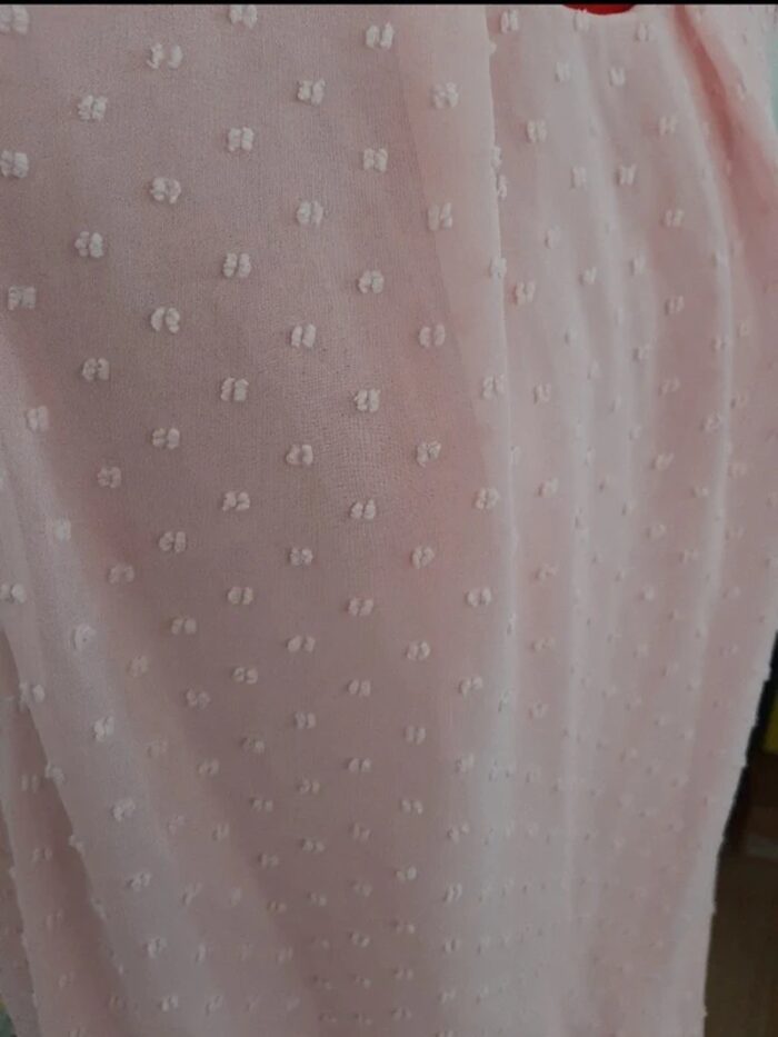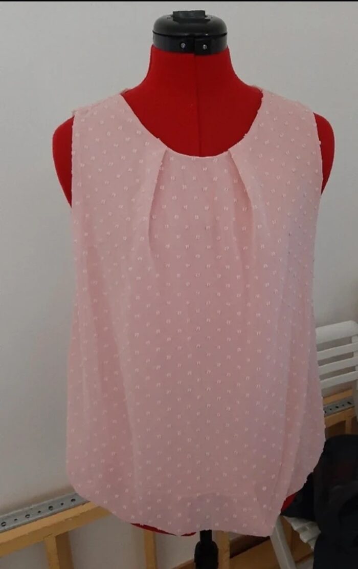 Blusa smanicata di tessuto rosa plumetis. Foderata e sblusata, nasconde benissimo eventuale pancetta.