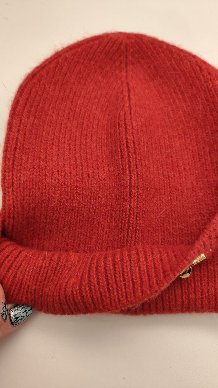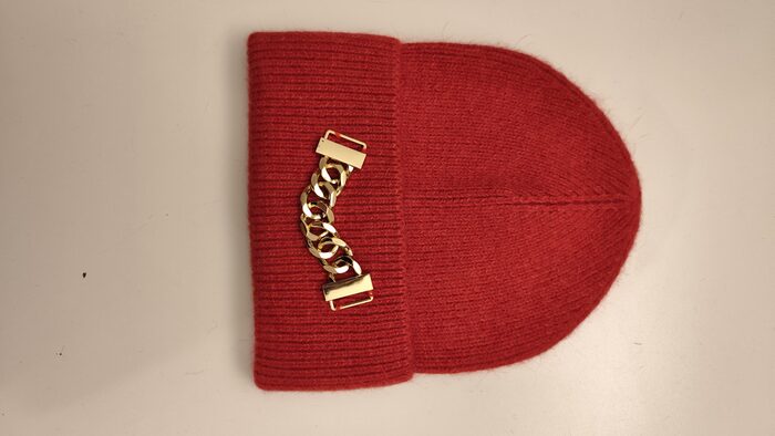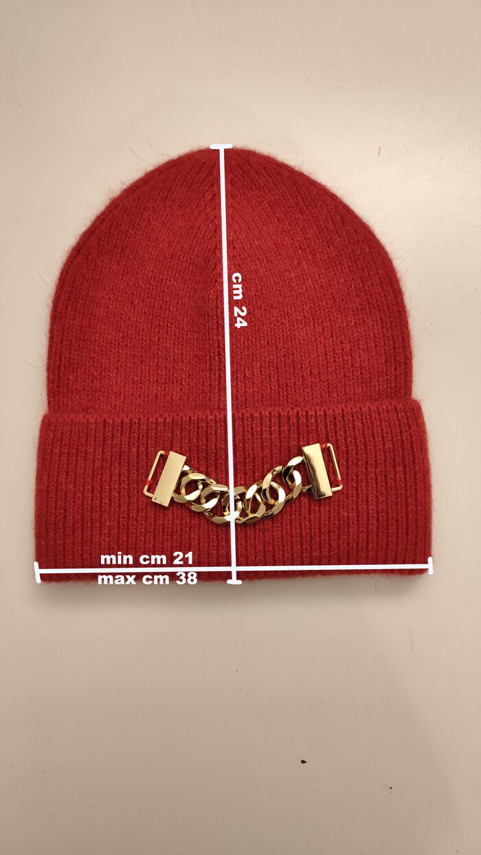 Cappello, berretto unisex, arancione con applicazione di catena dorata davanti, in perfetto stato, caldo e compatto, perfetto per un tocco di stile in più, elegante e particolare.