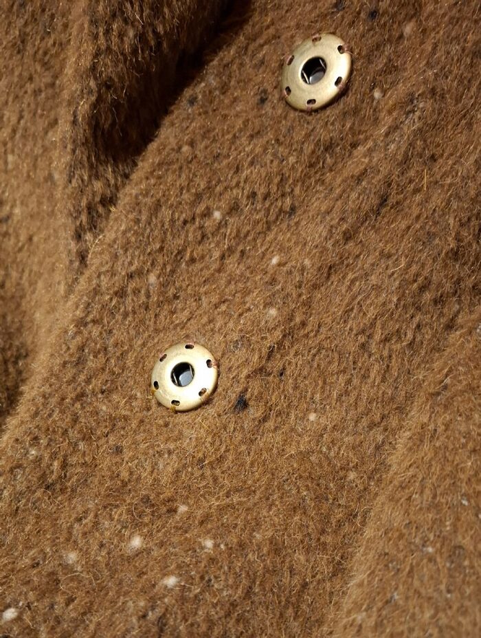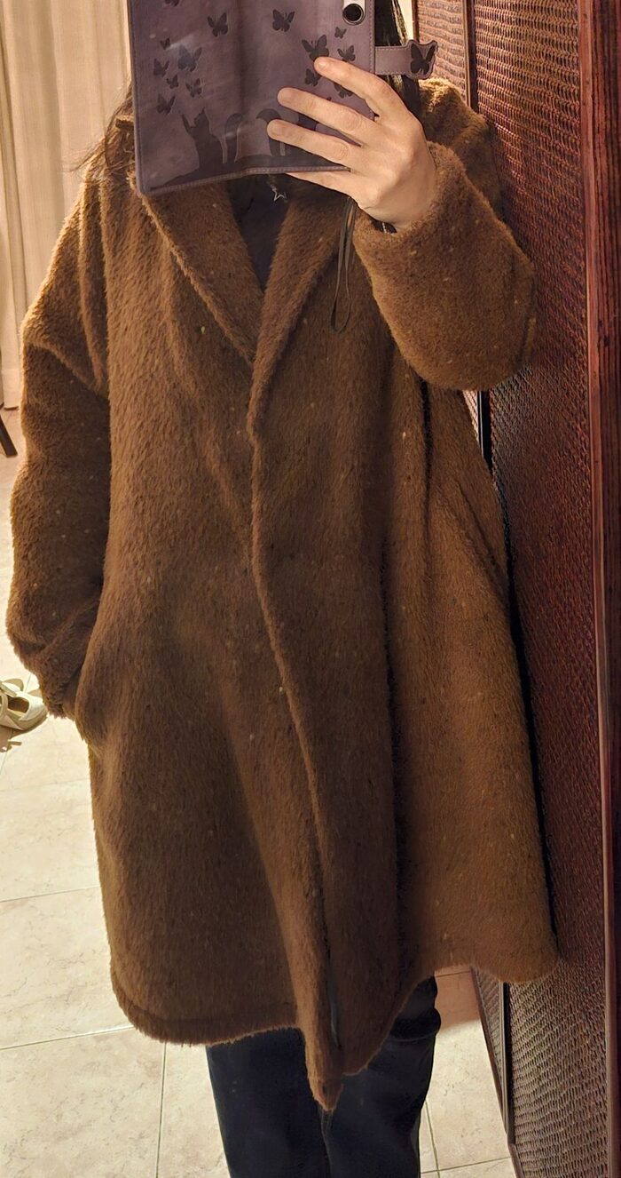 Non ha più etichette perché è stato riadattato dalla sarta (aveva i bordi di pelliccia e la cintura, dice la suocera), ma mi è stato assicurato che sia comunque lana e di marca, vado sulla fiducia, spero anche voi. ;)L''ho indossato io che sono una M (42/44) e mi va grandino, direi L quindi.Ha due bottoni a pressione e due tasche, stoffa molto bella, le foto fanno un po'' schifo e non rendono... (colore non così caldo e acceso come si vede nella prima foto). .