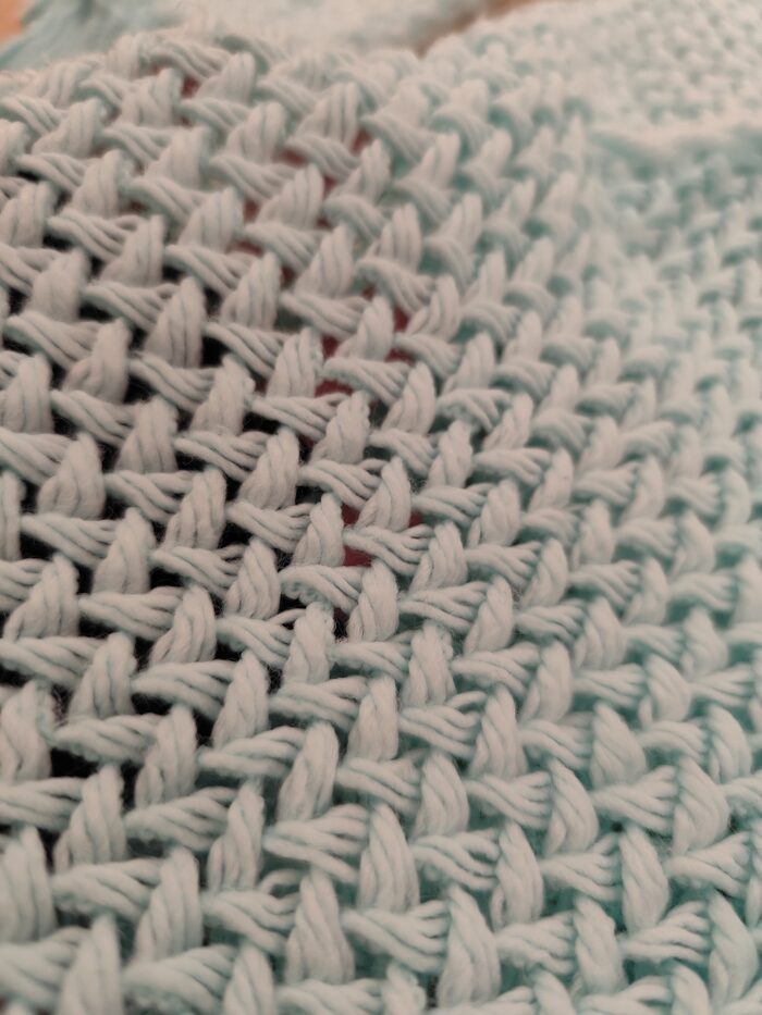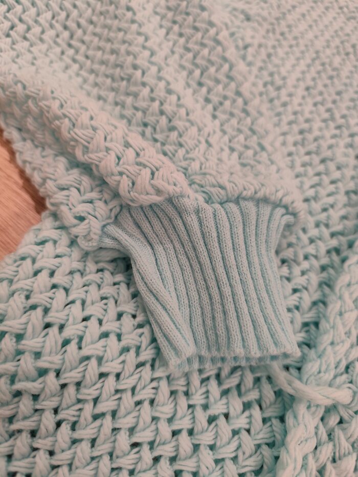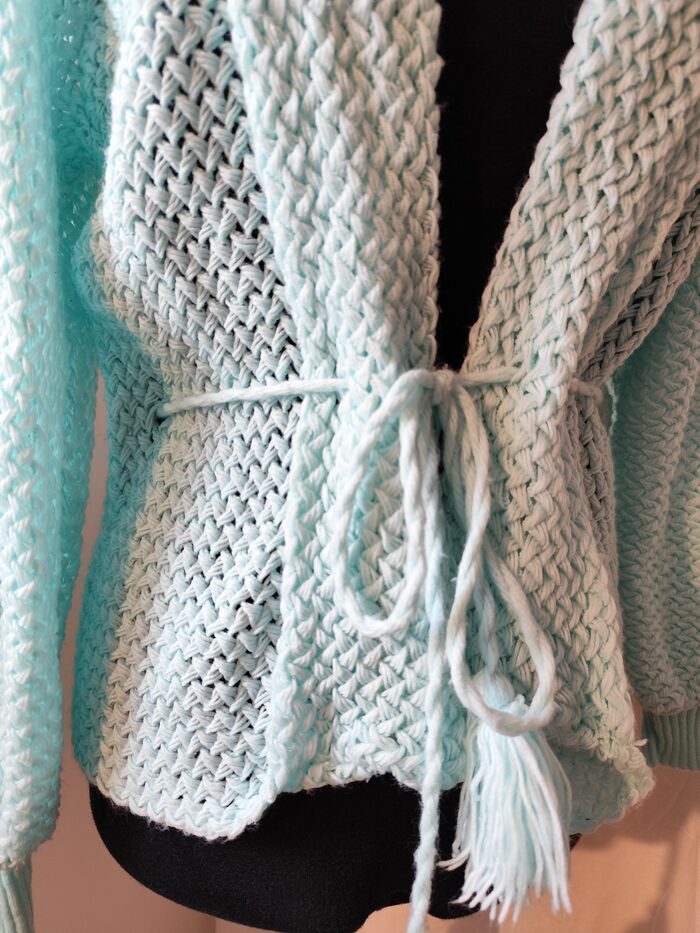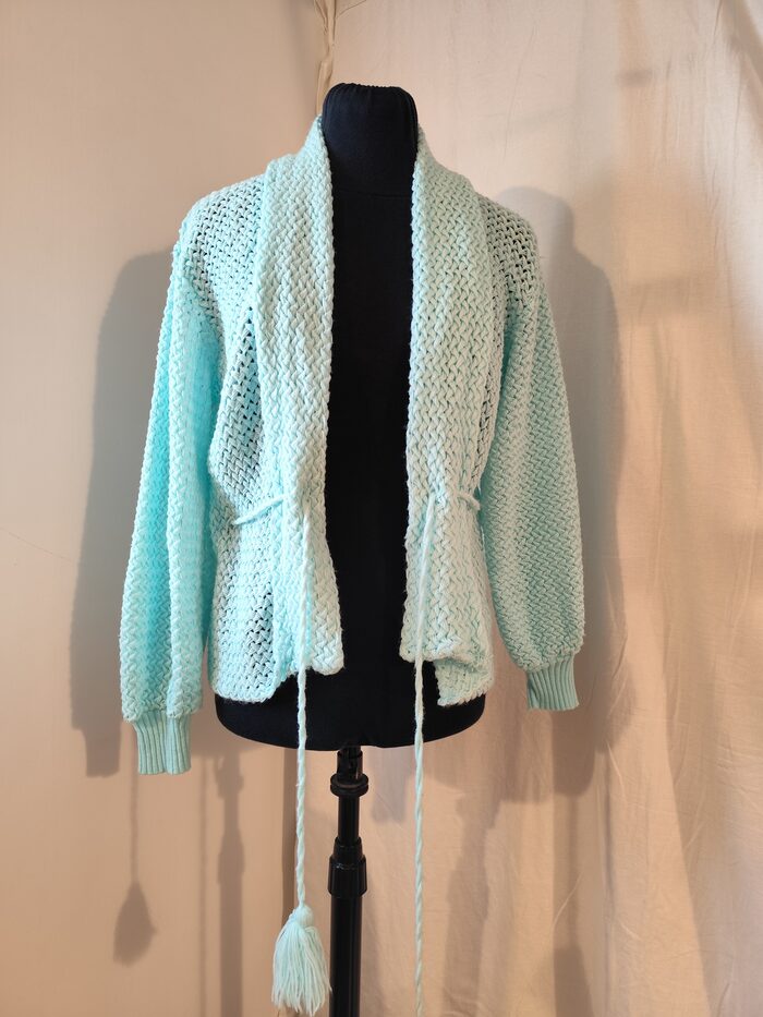 Cardigan in maglia color verde acqua. Modello corto con cordoncino in vita, maniche lunghe ampie e collo a scialle. Molto morbido, ha una lavorazione traforata, in perfetto stato senza difetti.