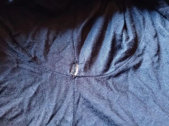Preso qui, bello ma non lo userei, perché 1) non è una M di cotone come veniva detto ma, come da etichette, una L di puro modal (è un bel tessuto, morbido e sottile, ma non fa per me); 2) dovrei prima chiedere a qualcuno di ricucirmi i 2 cm di scucitura non segnalati, che mostro in 3a foto (per il resto è in ottimo stato, vale la pena farlo). .