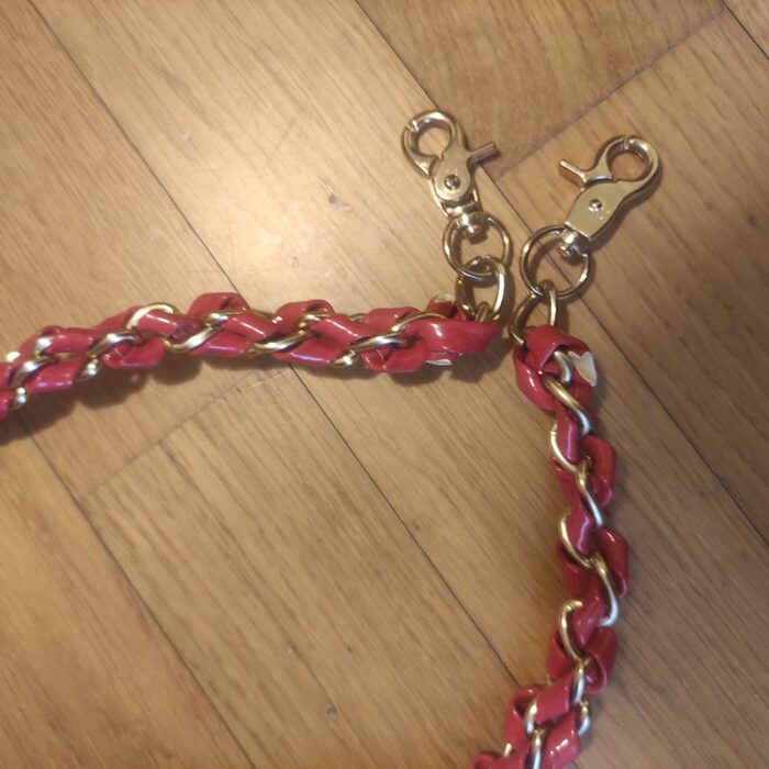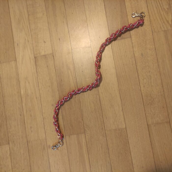 Catena tracolla in metallo e plastica bicolore , con moschettoni lunga 68 cm .