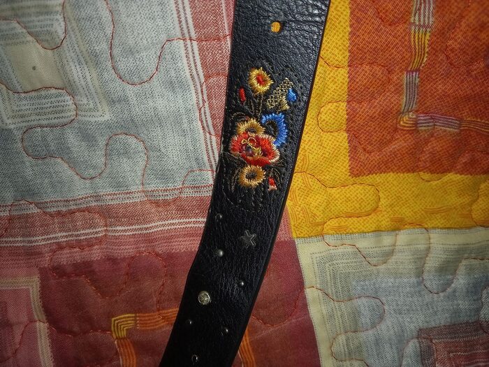 Cintura cuoio con ricami,borchiette,stelline in metallo e perline, è stato fatto un buco in più su un ricamo ( seconda foto).ma non è mai stata usata. Lunghezza totale cm 103 larghezza 3cm .