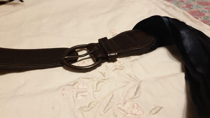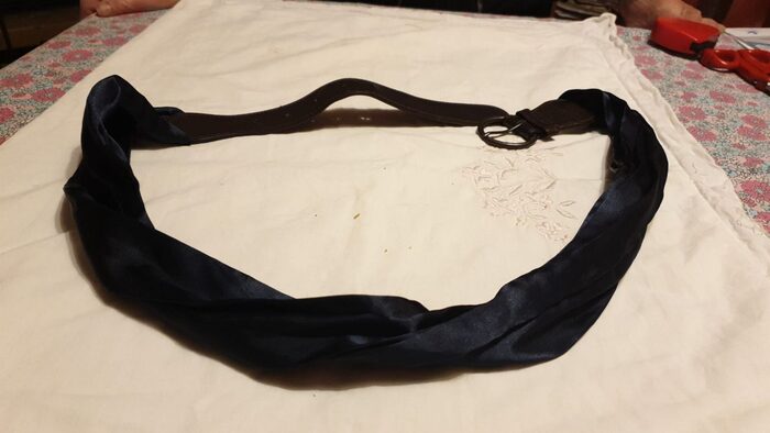 In stoffa blu lunga 110 . Non si vede bene ma è un bel blu .