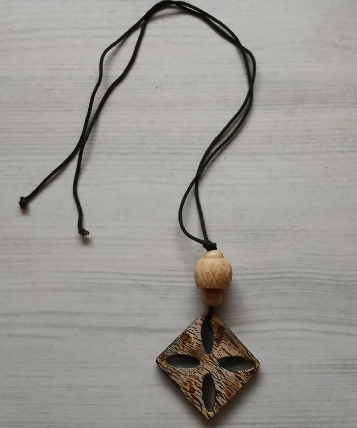In ottime condizioni, comprata ad un mercatino, forse mai usata. Imita il legno, ma è un altro materiale, forse una resina da bigiotteria. Il pendente misura 3,5x4 cm. Il cordino si regola a piacere. .