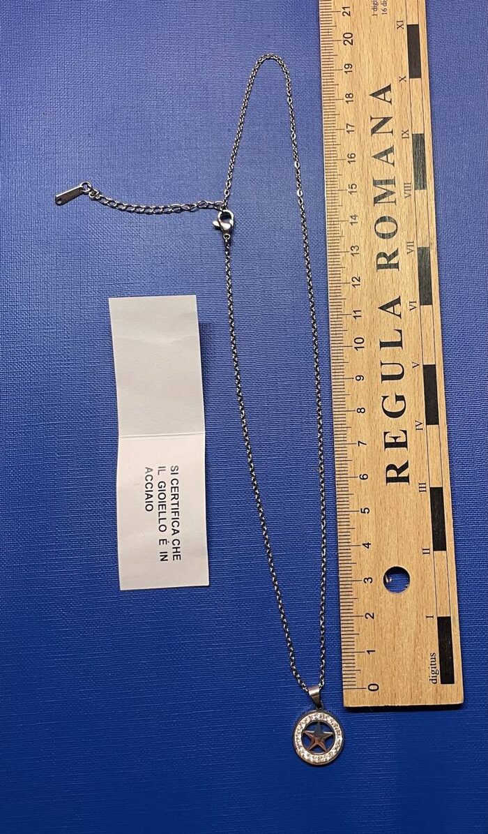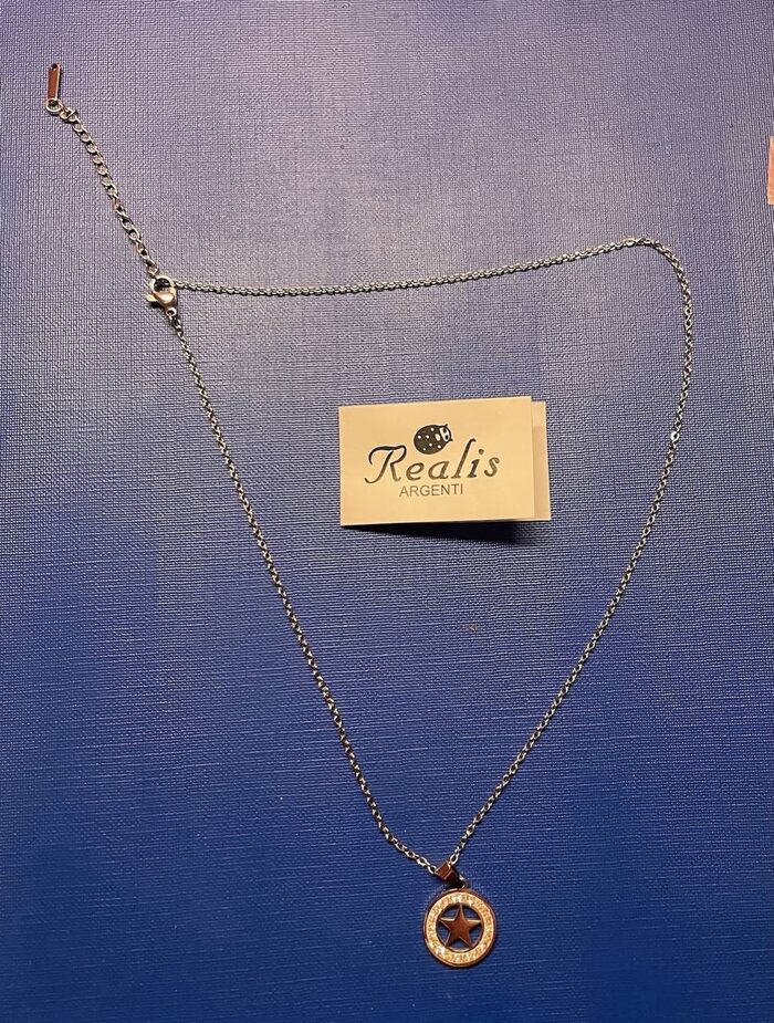 Delicata collana con pendente a forma di stella, incorniciata da zirconi. Il gioiello è realizzato in acciaio. Mai indossata.